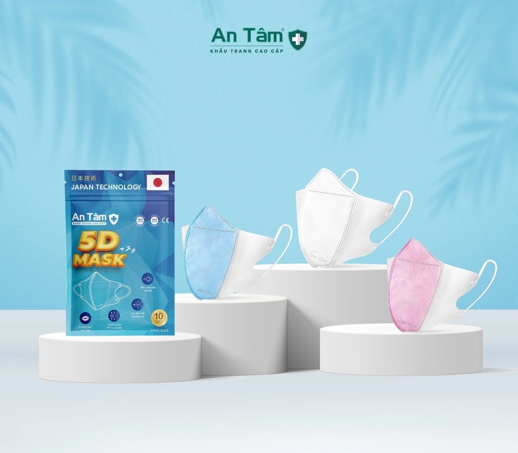 Thành phần: Khẩu trang kháng khuẩn 5D An Tâm bao gồm 3 lớp: 2 lớp vải lọc PP cao cấp (100% Polypropylene) và 1 lớp vải lọc kháng khuẩn Melt-blown ở giữa.