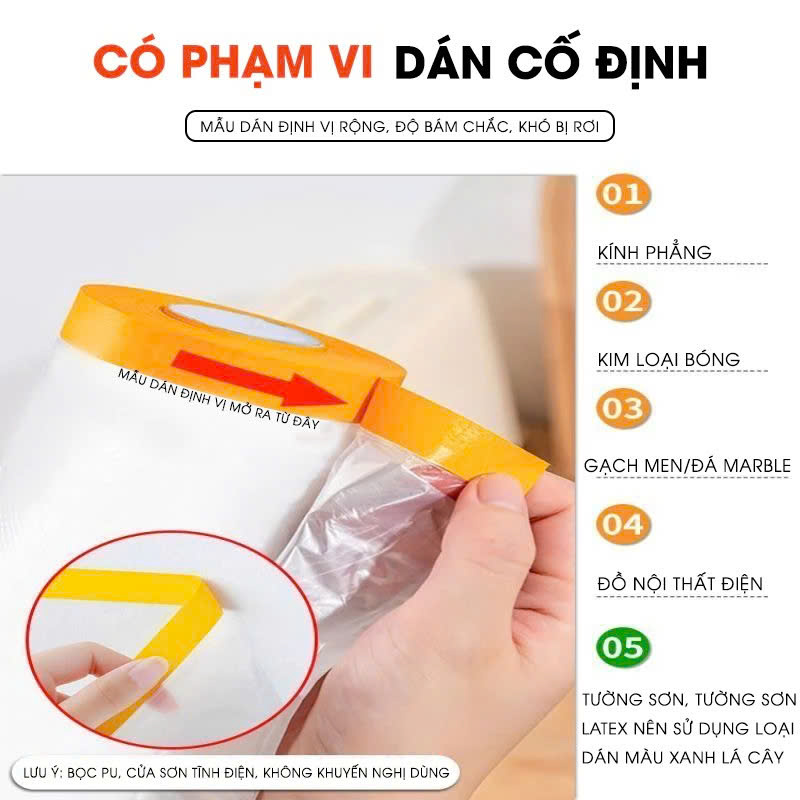 * Rộng 55cm dài 20m (Dán cố định 1 đầu băng dính màu vàng sau đó từ rộng 7cm có thể kéo các nếp gấp ra rộng tối đa 55cm). Dùng chủ yếu để che sơn, che đồ kích thước nhỏ