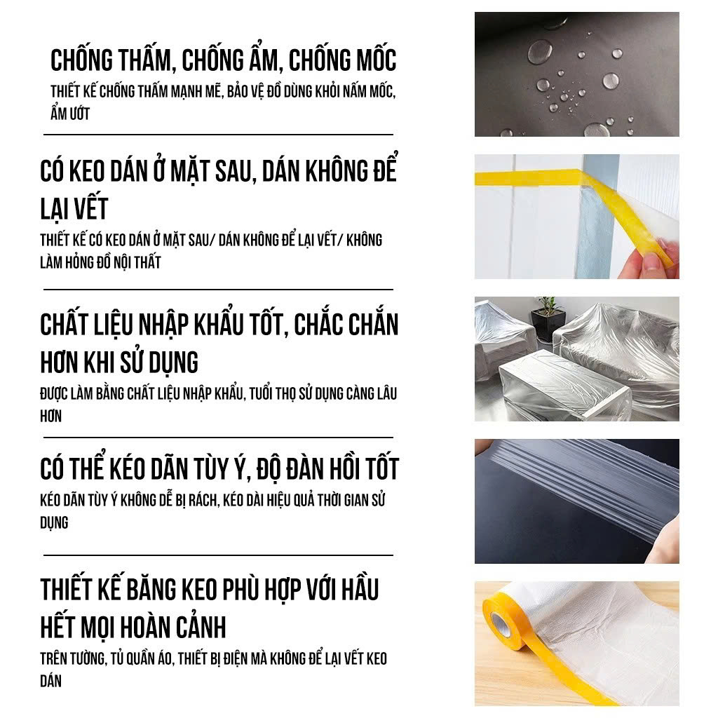 * Rộng 1,5m dài 20m (Dán cố định 1 đầu băng dính màu vàng sau đó từ rộng 20cm có thể kéo các nếp gấp ra rộng tối đa 1,5m). che đồ có kích thước lớn