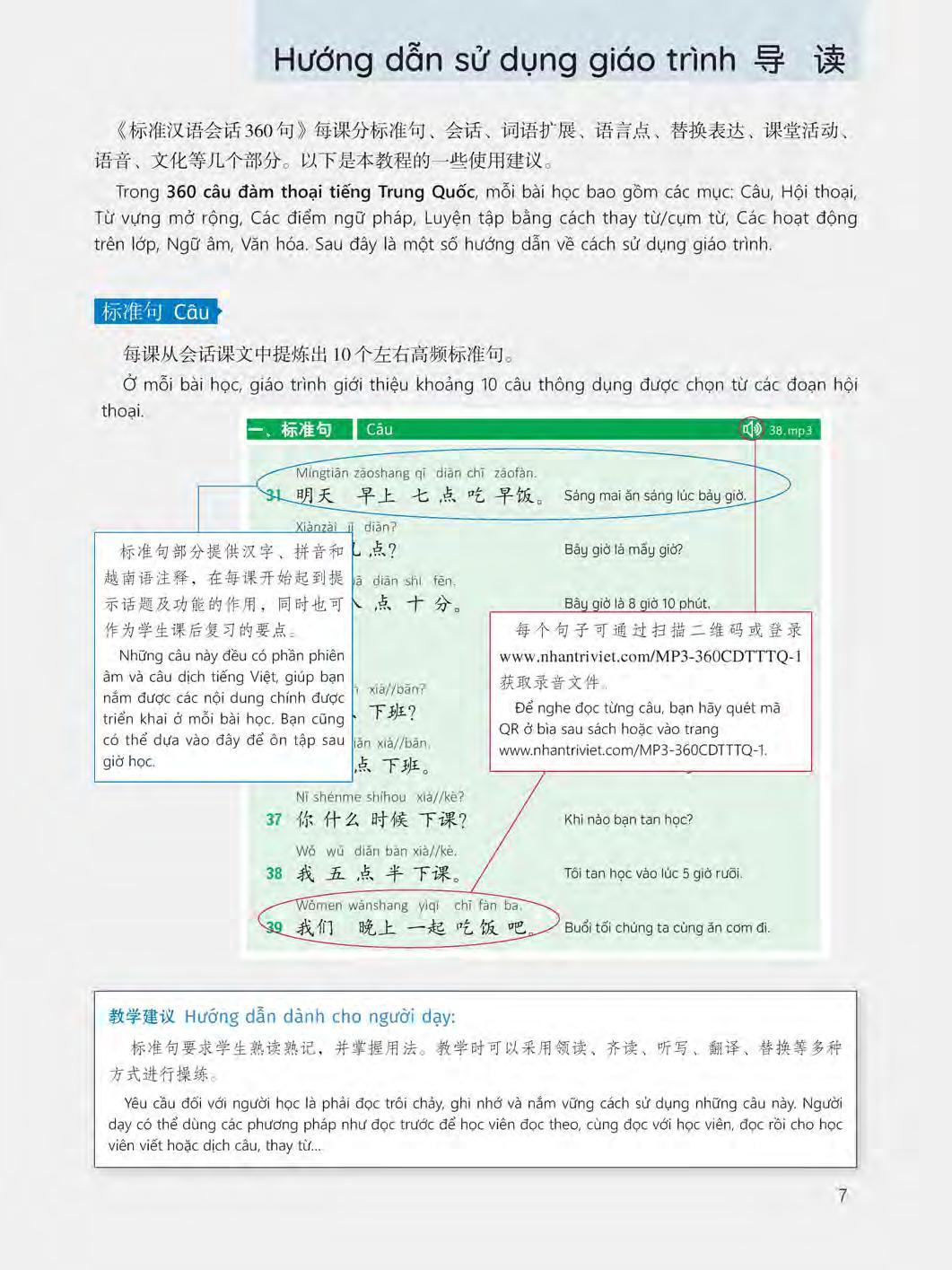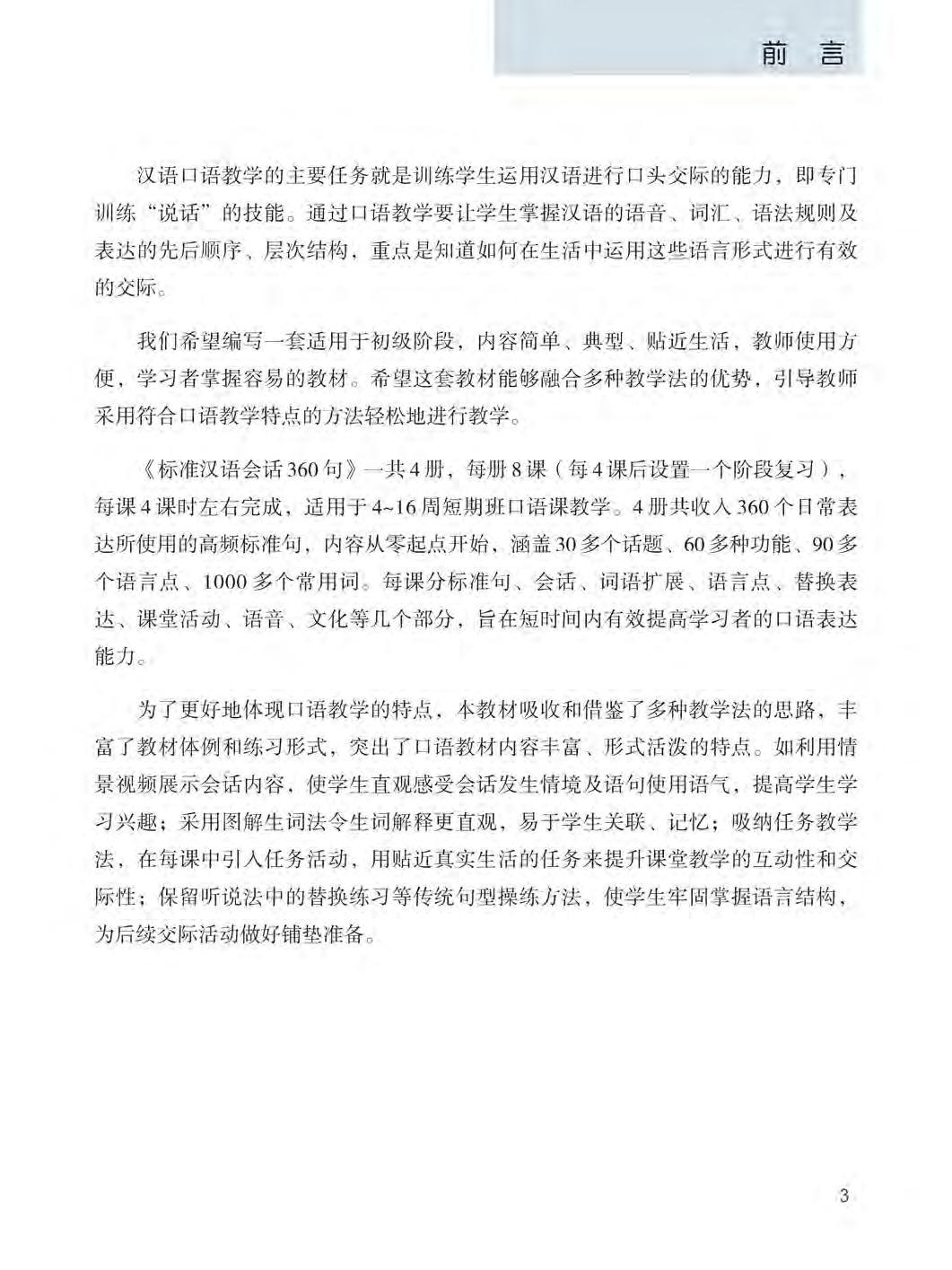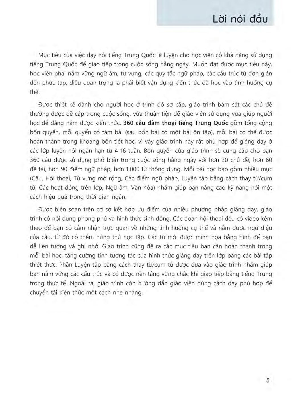Được thiết kế dành cho người học ở trình độ sơ cấp, giáo trình bám sát các chủ đề thường được đề cập trong cuộc sống, vừa thuận tiện để giáo viên sử dụng vừa giúp người học dễ dàng nắm được kiến thức. 360 câu đàm thoại tiếng Trung Quốc gồm tổng cộng bốn quyển, mỗi quyển có tám bài (sau bốn bài có một bài ôn tập), mỗi bài có thể được hoàn thành trong khoảng bốn tiết học, vì vậy giáo trình này rất phù hợp để giảng dạy ở các lớp luyện nói ngắn hạn từ 4-16 tuần.