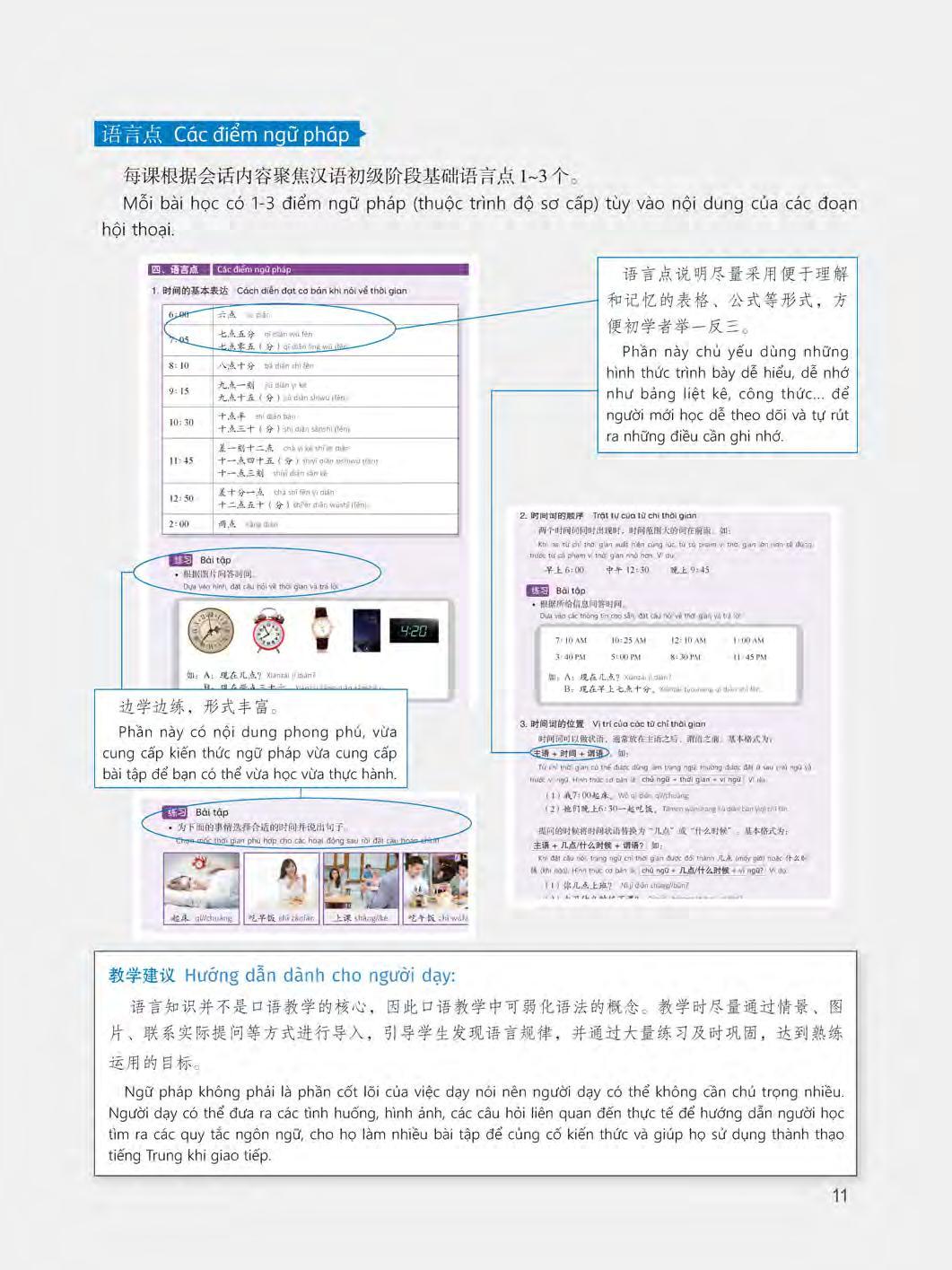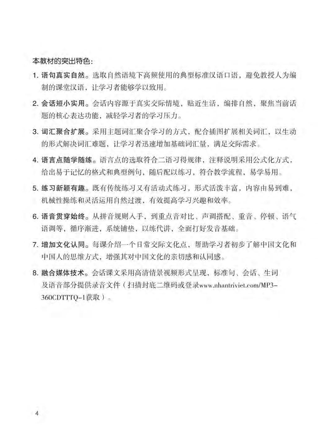 Bốn quyển của giáo trình sẽ cung cấp cho bạn 360 câu được sử dụng phổ biến trong cuộc sống hằng ngày với hơn 30 chủ đề, hơn 60 đề tài, hơn 90 điểm ngữ pháp, hơn 1.000 từ thông dụng. Mỗi bài học bao gồm nhiều mục (Câu, Hội thoại, Từ vựng mở rộng, Các điểm ngữ pháp, Luyện tập bằng cách thay từ/cụm từ, Các hoạt động trên lớp, Ngữ âm, Văn hóa) nhằm giúp bạn nâng cao kỹ năng nói một cách hiệu quả trong thời gian ngắn.