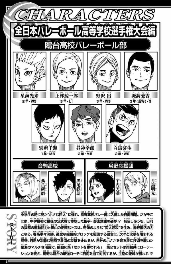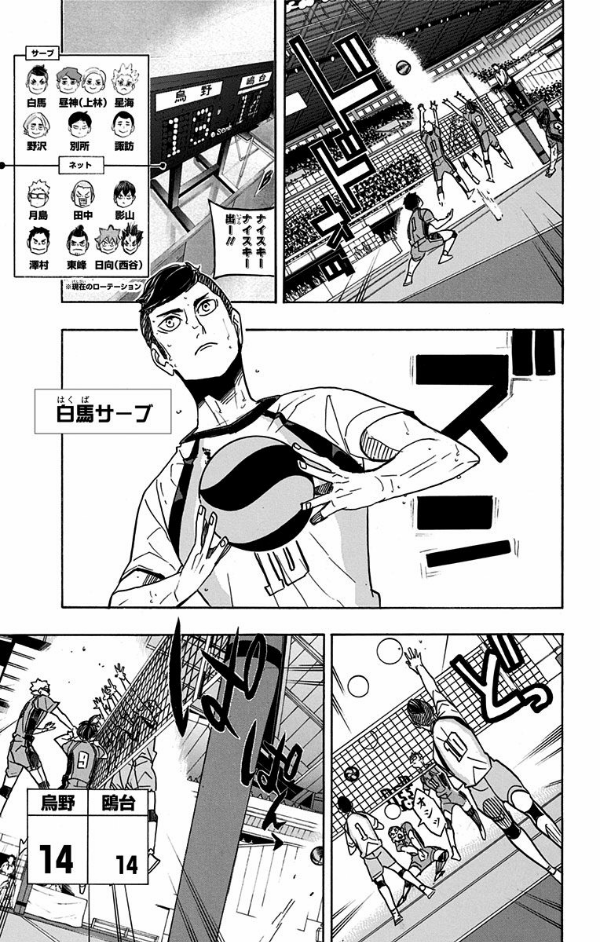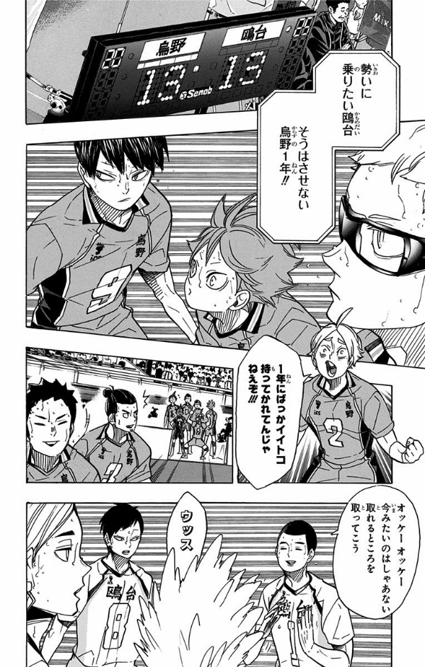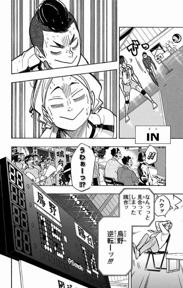 一進一退の試合の中、鴎台に狙われて活路が開けず、失点の罪悪感に苛まれる東峰。重圧を超え気負わず力を発揮する昼神のブロックを破るために、為すべき事は何か──。いま静かに、烏野の主砲が覚醒する…!!