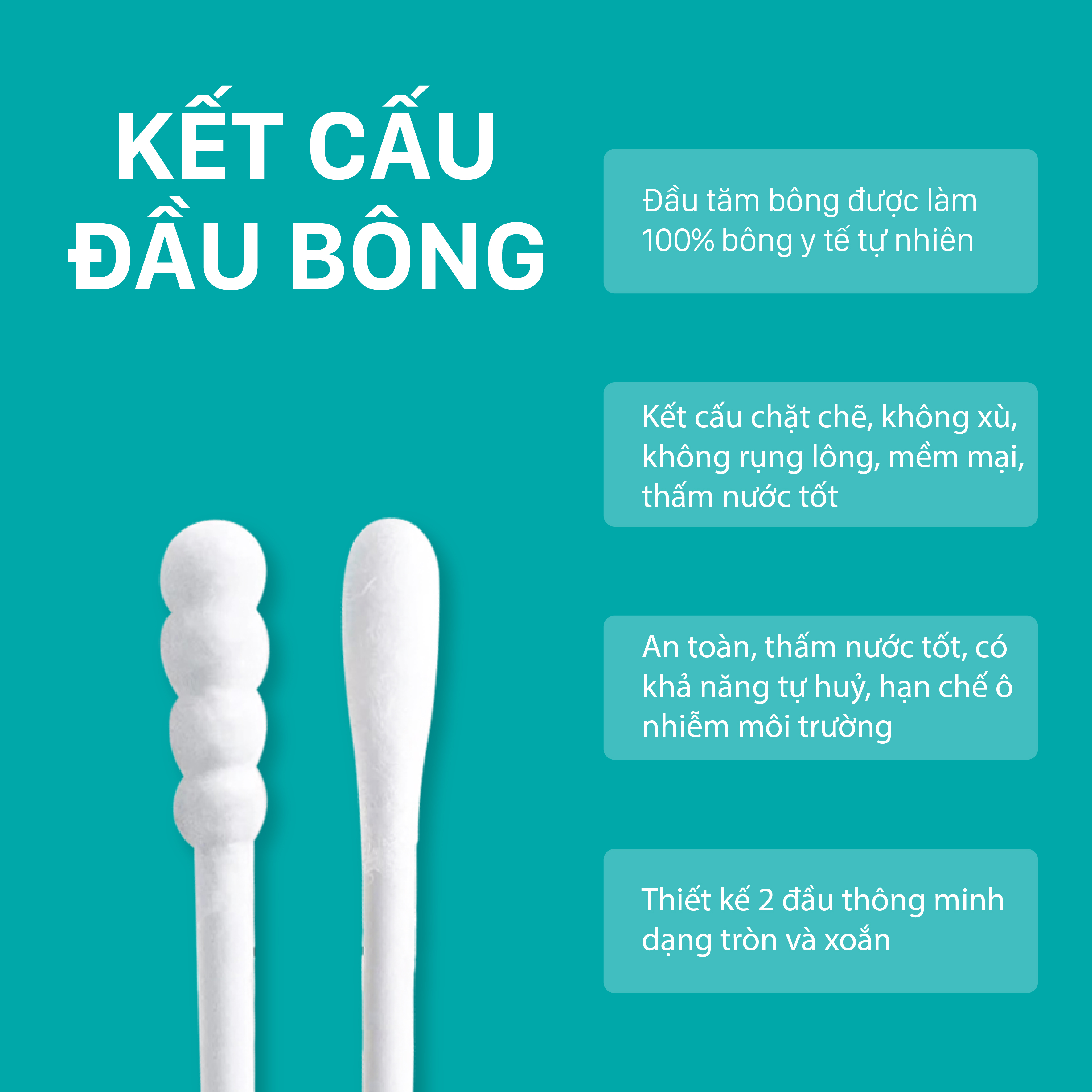 - Đầu tăm bông được làm 100% bông y tế tự nhiên không xù, không rụng lông, mềm mại, thấm nước tốt, an toàn, có khả năng tự huỷ, hạn chế ô nhiễm môi trường.