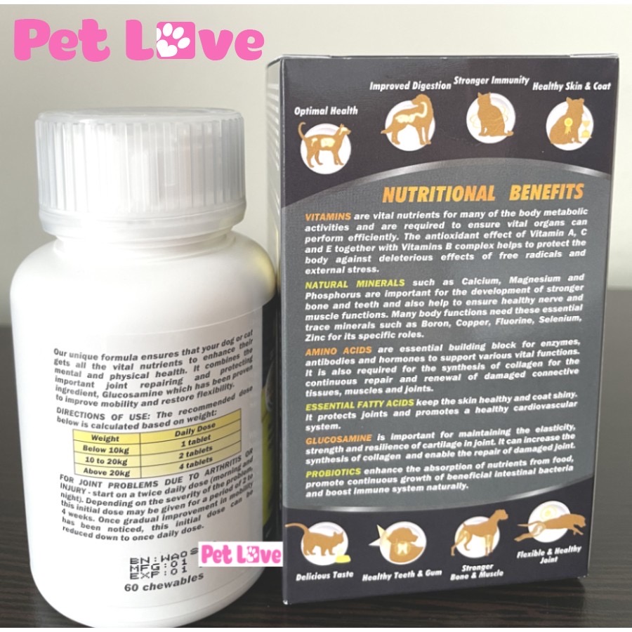 * Bổ sung vitamin tổng hợp, acid amin, khoáng chất thiết yếu và các vi sinh vật có lợi cho đường ruột chó mèo.