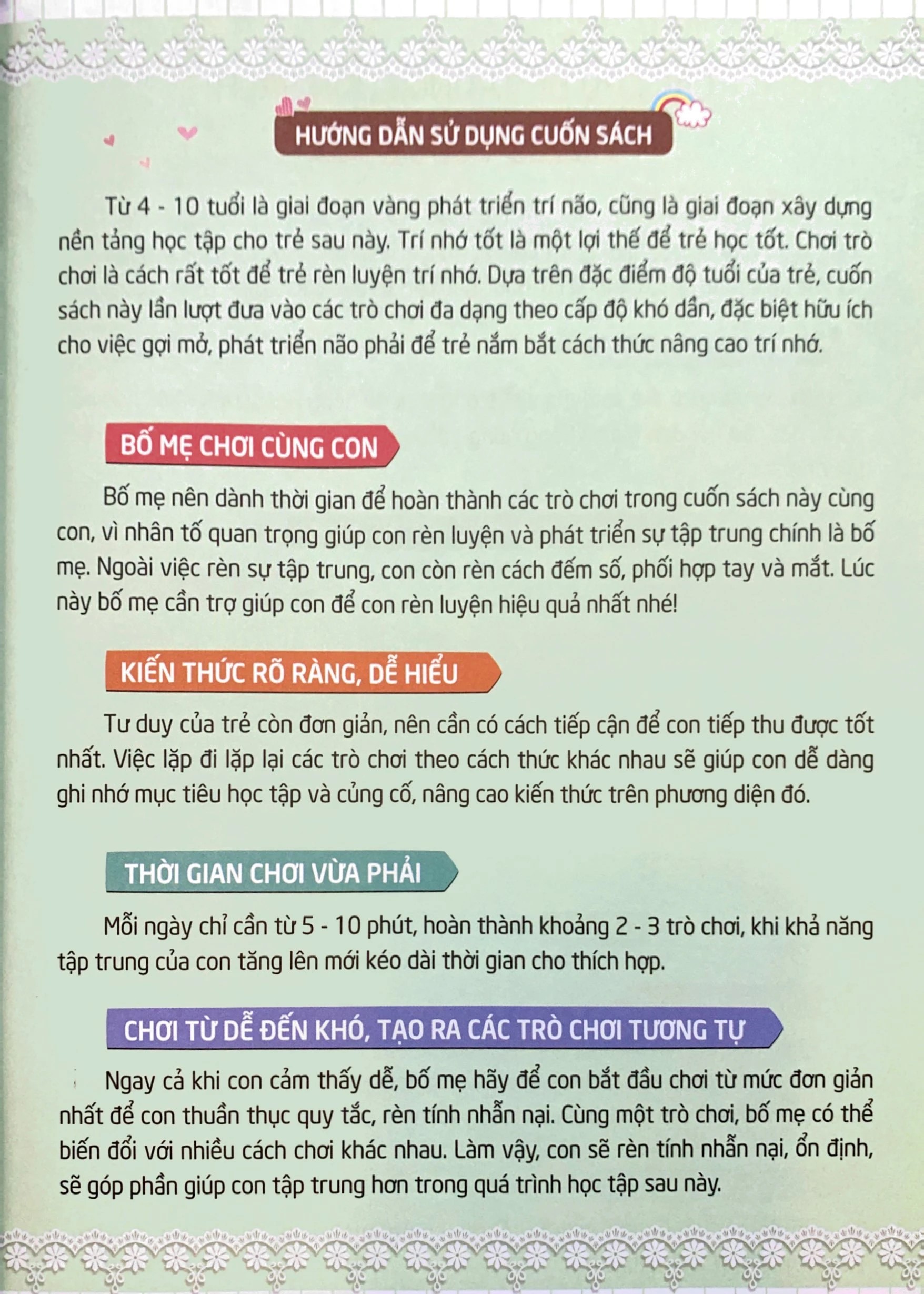- Qua 500 trò chơi đa dạng, cuốn sách không chỉ giúp trẻ phát triển trí nhớ mà còn kích thích trí tưởng tượng, khả năng quan sát và tư duy logic.