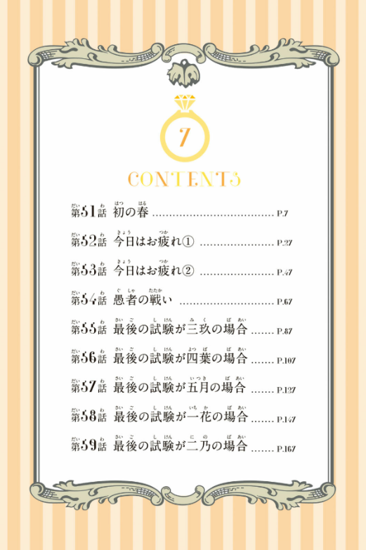 「落第寸前」「勉強嫌い」の美少女五つ子を、アルバイト家庭教師として「卒業」まで導くことになった風太郎。トラブル続きだった期末試験。自身の力不足を理由に、風太郎は家庭教師を退任しようと決意する。しかし、家を出てまで教えを乞う五つ子たちの覚悟を目の当たりにし、家庭教師を継続することに。次こそは「全教科赤点回避」!風太郎と中野家五つ子の楽しい一年が幕を開ける──!!