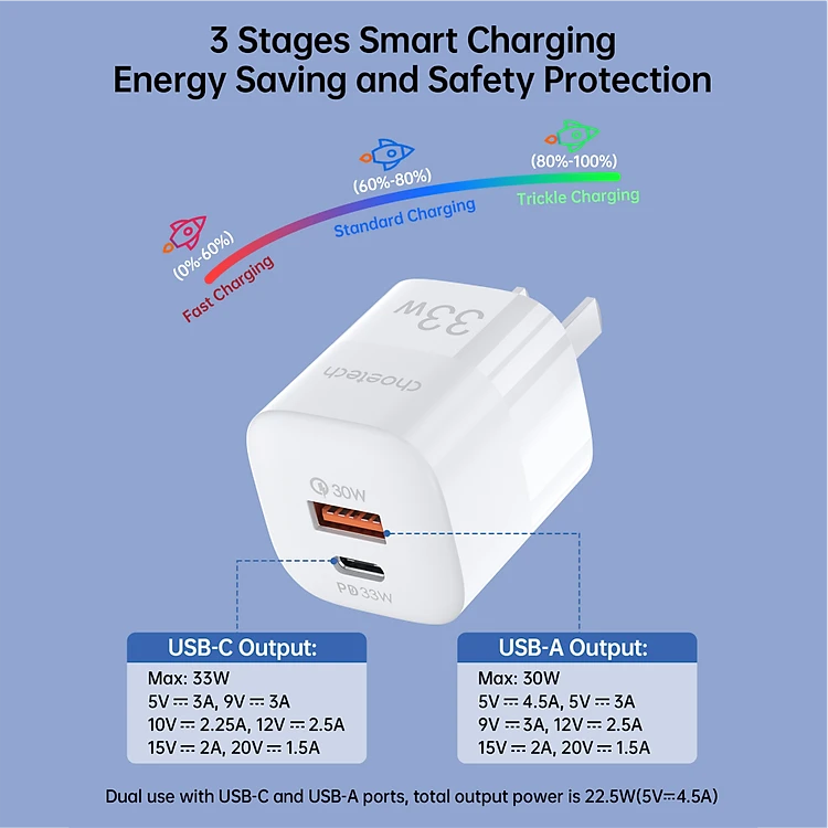 Thông số kỹ thuật Adapter Củ Sạc 33W PPS/ PD 30W / QC 3.0 1 Cổng Type C 1 Cổng USB Nhỏ Gọn CHOETECH PD5006 Sạc Nhanh iPhone, iPad, Samsung - Hàng Chính Hãng