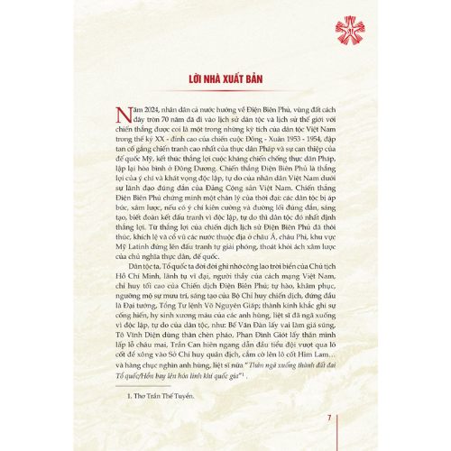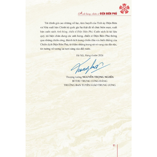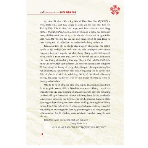 Kỷ niệm 70 năm chiến thắng lịch sử Điện Biên Phủ (07/5/1954 - 07/5/2024), Nhà xuất bản Chính trị quốc gia Sự thật phối hợp với Tỉnh ủy Điện Biên tổ chức biên soạn, xuất bản cuốn sách Anh hùng, chiến sĩ Điện Biên Phủ. Cuốn sách là ấn phẩm có ý nghĩa đặc biệt quan trọng, thể hiện tình cảm và sự tri ân sâu sắc của các thế hệ người dân Việt Nam đối với công lao của các anh hùng, liệt sĩ đã anh dũng hy sinh xương máu và tuổi thanh xuân cho chiến thắng vĩ đại này.
