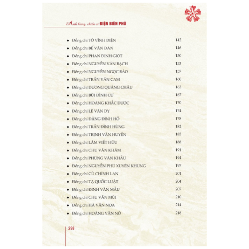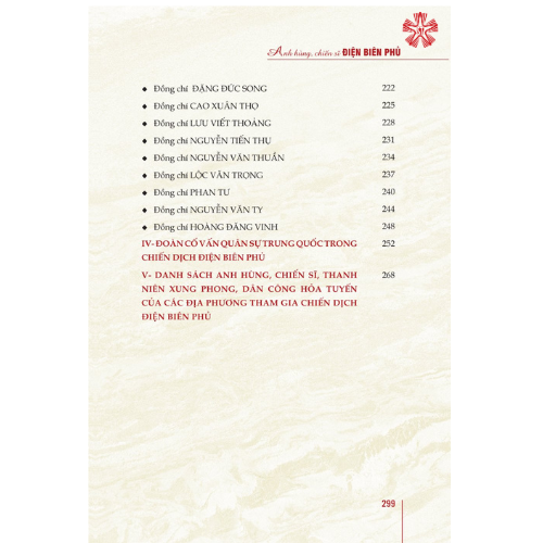 Trên cơ sở tiếp cận tư liệu từ nhiều nguồn khác nhau, đặc biệt là nguồn tư liệu do Hội Cựu chiến binh các tỉnh, thành phố trên cả nước cung cấp, bản sách in phác họa chân dung những người chỉ huy, anh hùng, chiến sĩ Điện Biên Phủ, từ vị Chỉ huy tối cao của Chiến dịch, của cuộc kháng chiến chống thực dân Pháp là Chủ tịch Hồ Chí Minh, từ Bộ Chỉ huy Chiến dịch đến Ban Chỉ huy của các đại đoàn cùng hơn 30 Anh hùng Lực lượng vũ trang nhân dân góp phần quan trọng làm nên chiến thắng lịch sử Điện Biên Phủ. Song song với đó là bản sách điện tử gồm danh sách các anh hùng, liệt sĩ, bộ đội, thanh niên xung phong, dân công hỏa tuyế của 53 tỉnh, thành phố trên cả nước đã tham gia chiến dịch.