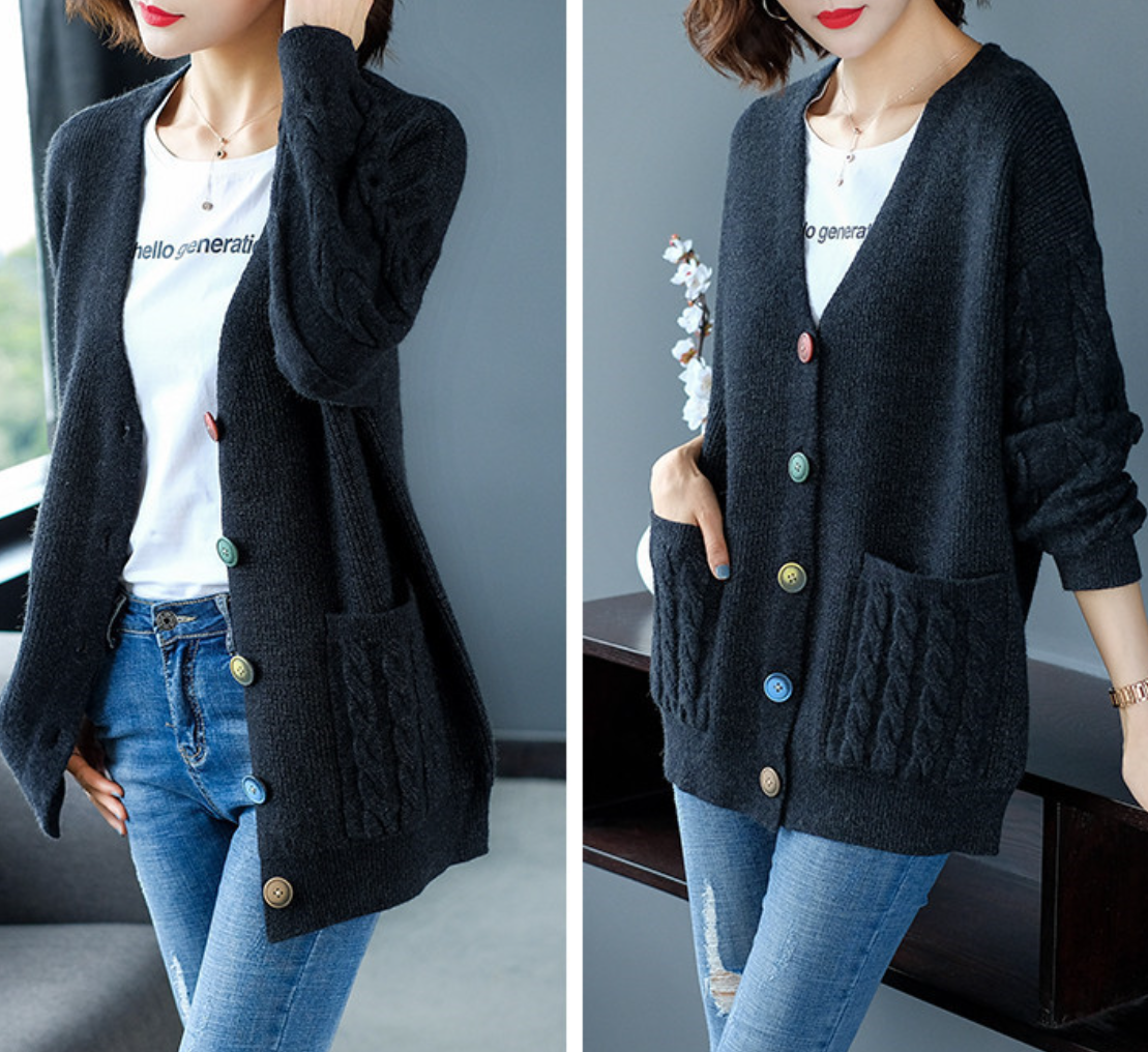- Kiểu dáng: Kiểu cardigan thả dáng, nhẹ nhàng, mặc suốt bốn mùa. Hàng cúc xinh xắn.