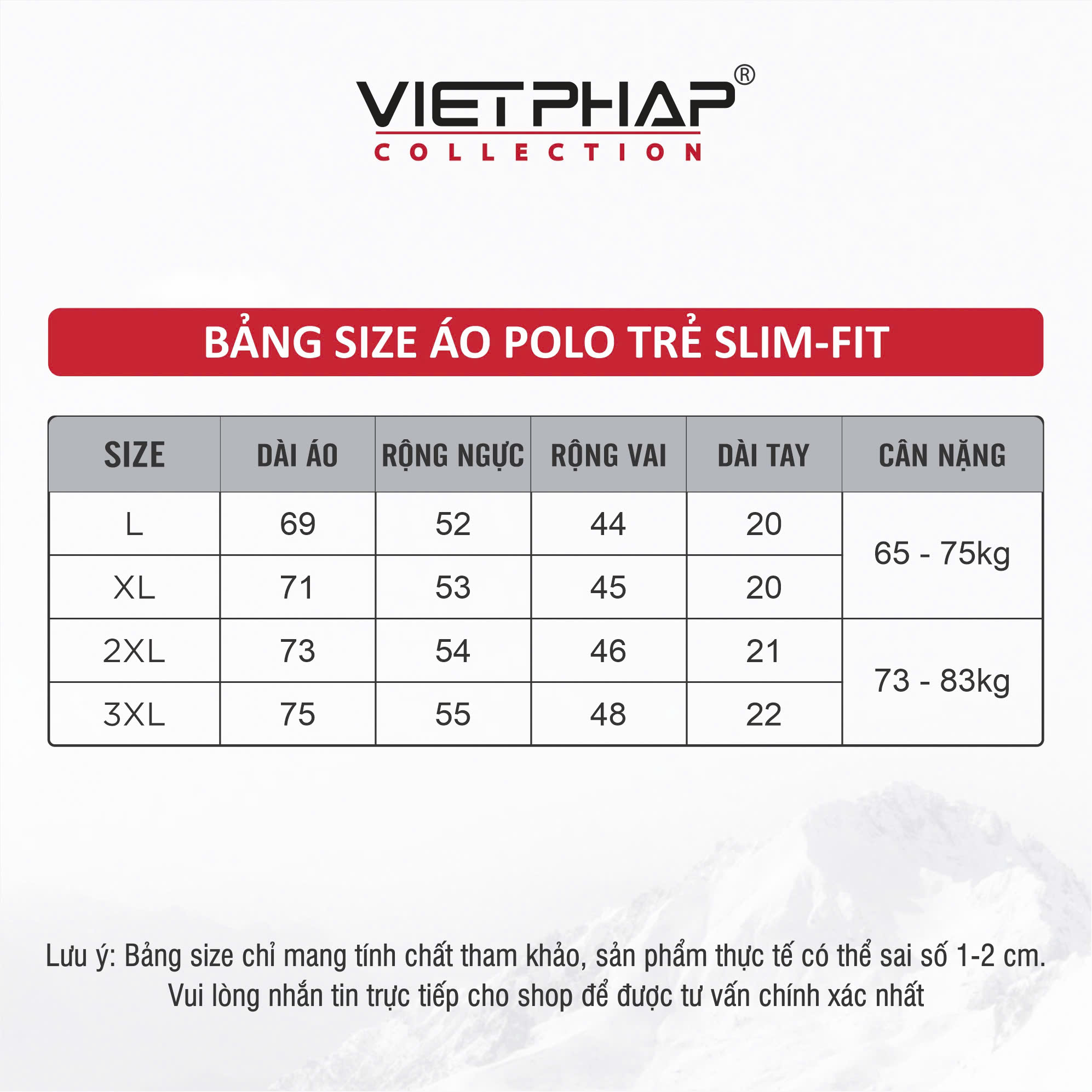 - Bảng size chart chỉ mang tính chất tham khảo, tùy thuộc vào số đo cơ thể mỗi người và chất liệu vải khác nhau sẽ có sự chênh lệch nhất định từ 1 - 2cm.