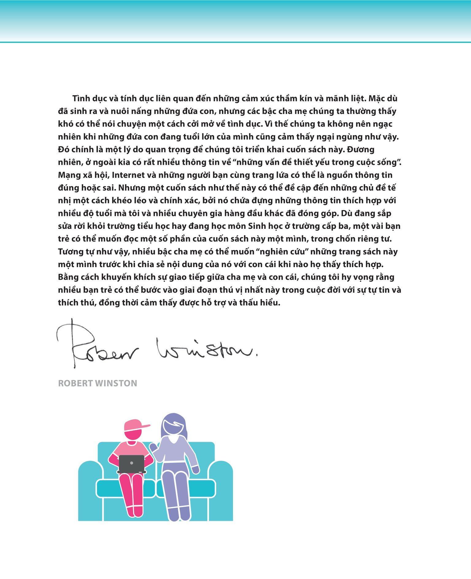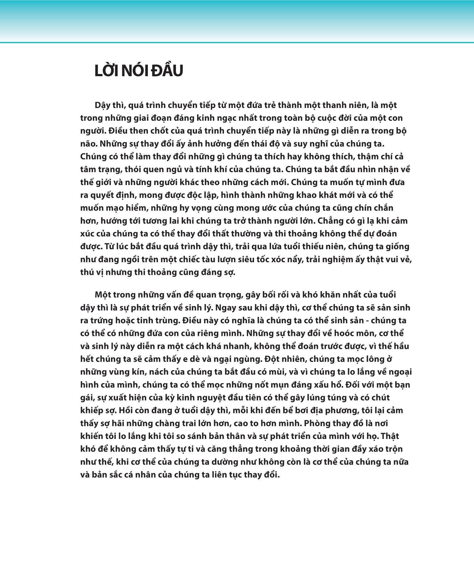 Dậy thì - quá trình chuyển tiếp từ một đứa trẻ thành một thanh niên, là một trong những giai đoạn đáng kinh ngạc nhất trong toàn bộ cuộc đời của một con người. Lứa tuổi dậy thì với mỗi bạn trẻ có thể đầy thú vị, vui nhộn hay kỳ diệu, nhưng cũng có thể sẽ vô cùng khó khăn, bối rối và căng thẳng. Thật khó để không cảm thấy tự ti và căng thẳng trong khoảng thời gian đầy xáo trộn như thế, khi cơ thể của chúng ta dường như không còn là cơ thể của chúng ta nữa và bản sắc cá nhân của chúng ta thì liên tục thay đổi. Cha mẹ của các bạn trẻ đang ở lứa tuổi dậy thì chắc chắn cũng sẽ tràn đầy cảm xúc như thế.