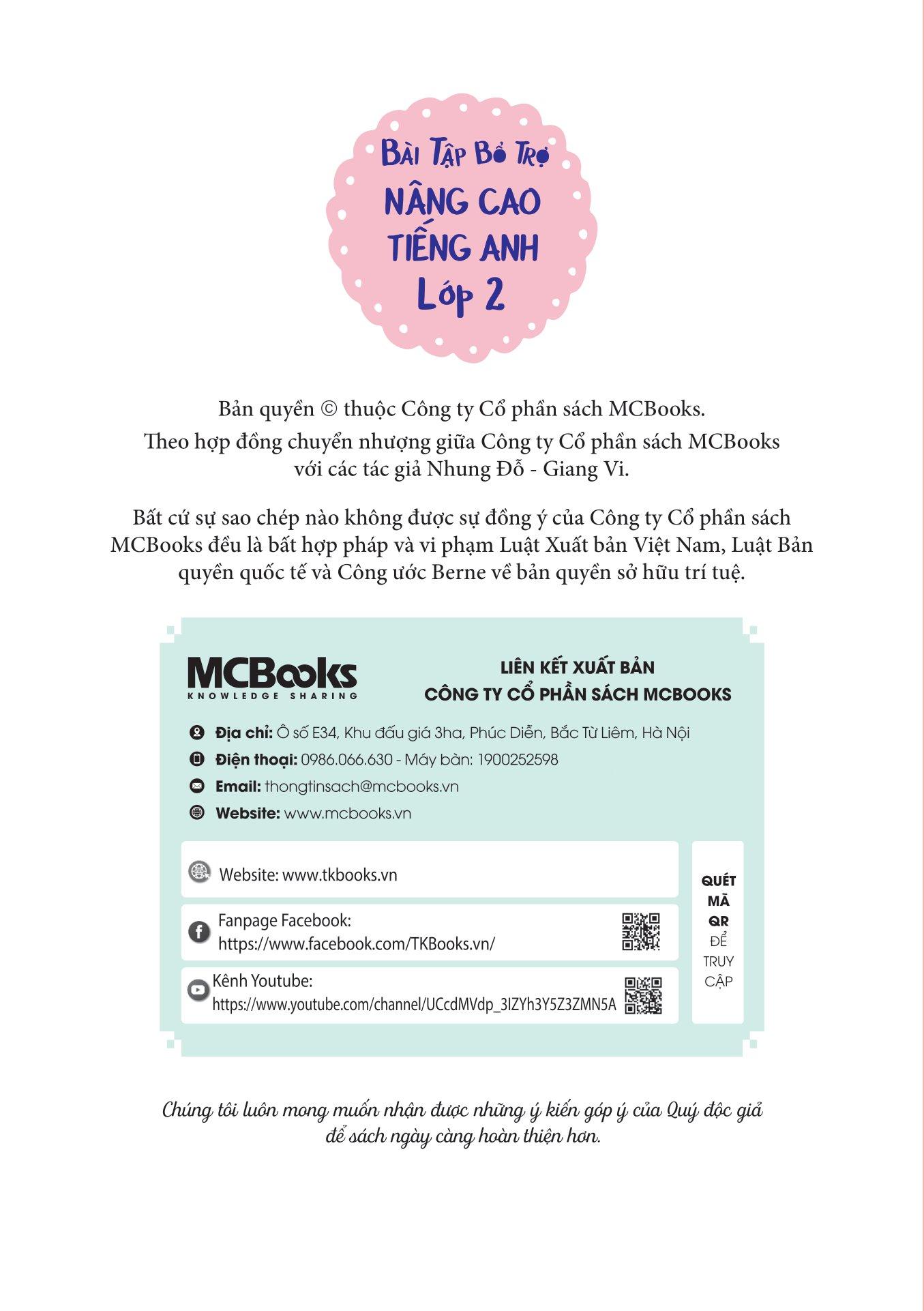 Hiểu rõ tầm quan trọng của môn tiếng Anh với mọi học sinh tiểu học, TKBooks cùng các thầy cô giáo xuất bản cuốn sách Bài tập bổ trợ nâng cao tiếng Anh Lớp 2, với mục đích cung cấp cho các em học sinh lớp 2 một cuốn sách tham khảo để giúp các em có thể học và ôn luyện kiến thức, kỹ năng tiếng Anh một cách dễ dàng và hiệu quả.