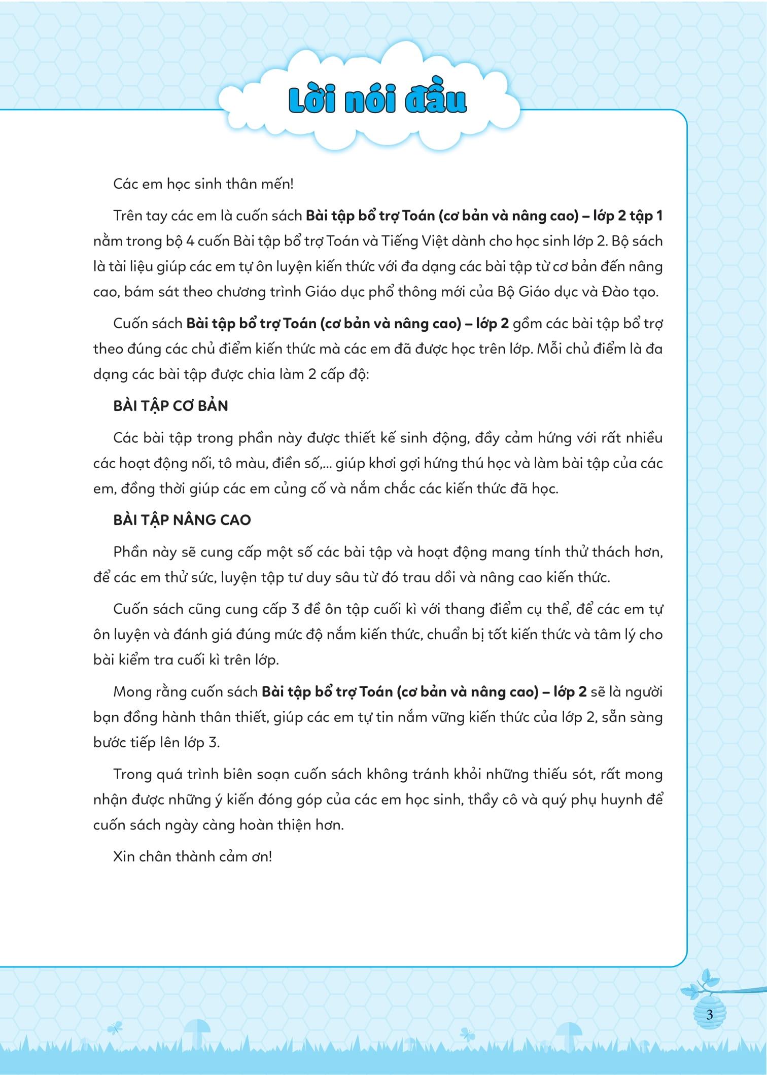 Mong rằng cuốn sách Bài tập bổ trợ Toán – lớp 2 (cơ bản và nâng cao) Tập 1 sẽ là người bạn đồng hành thân thiết, giúp các em tự tin nắm vững kiến thức của lớp 2, sẵn sàng bước tiếp lên lớp 3.