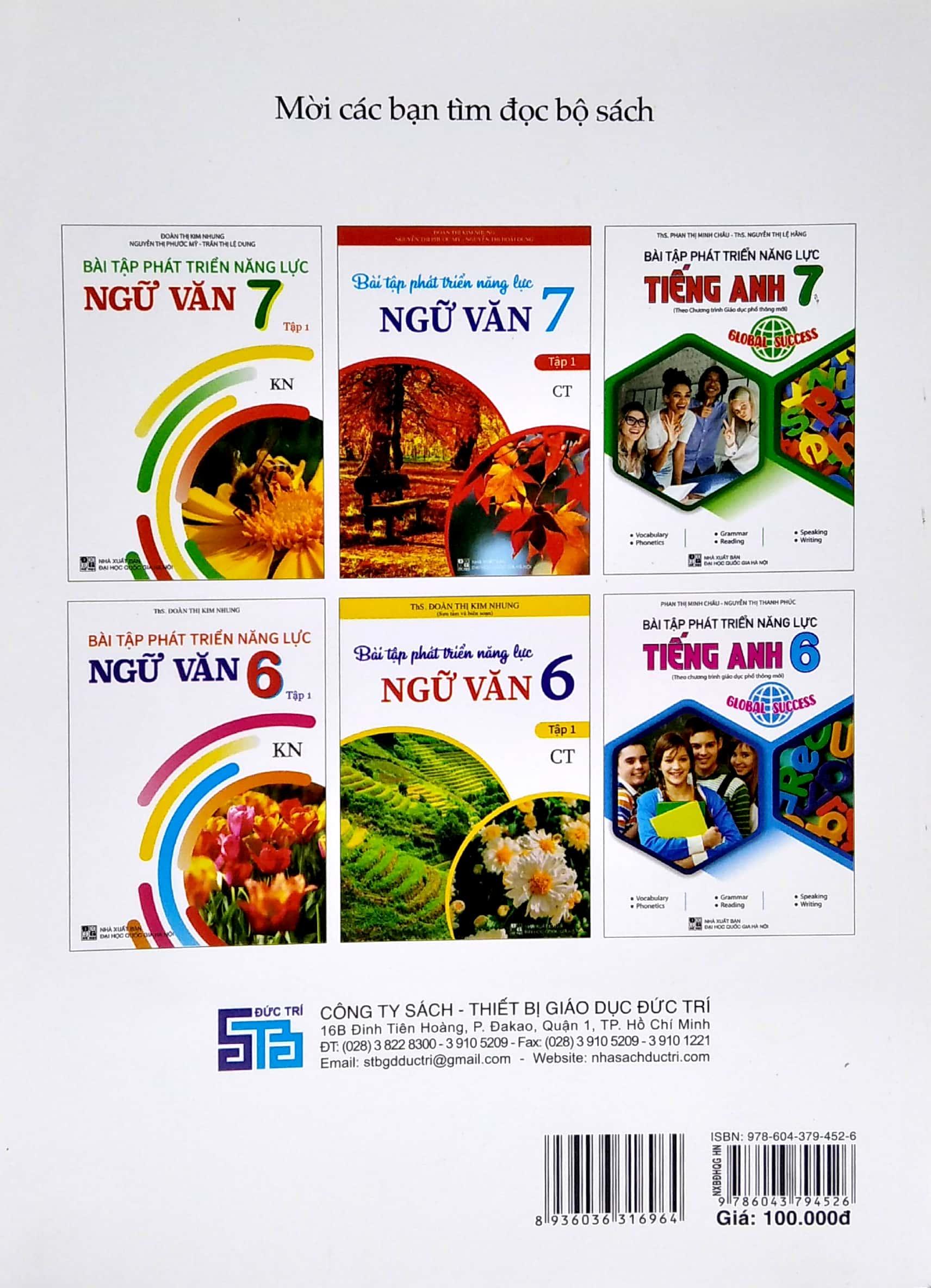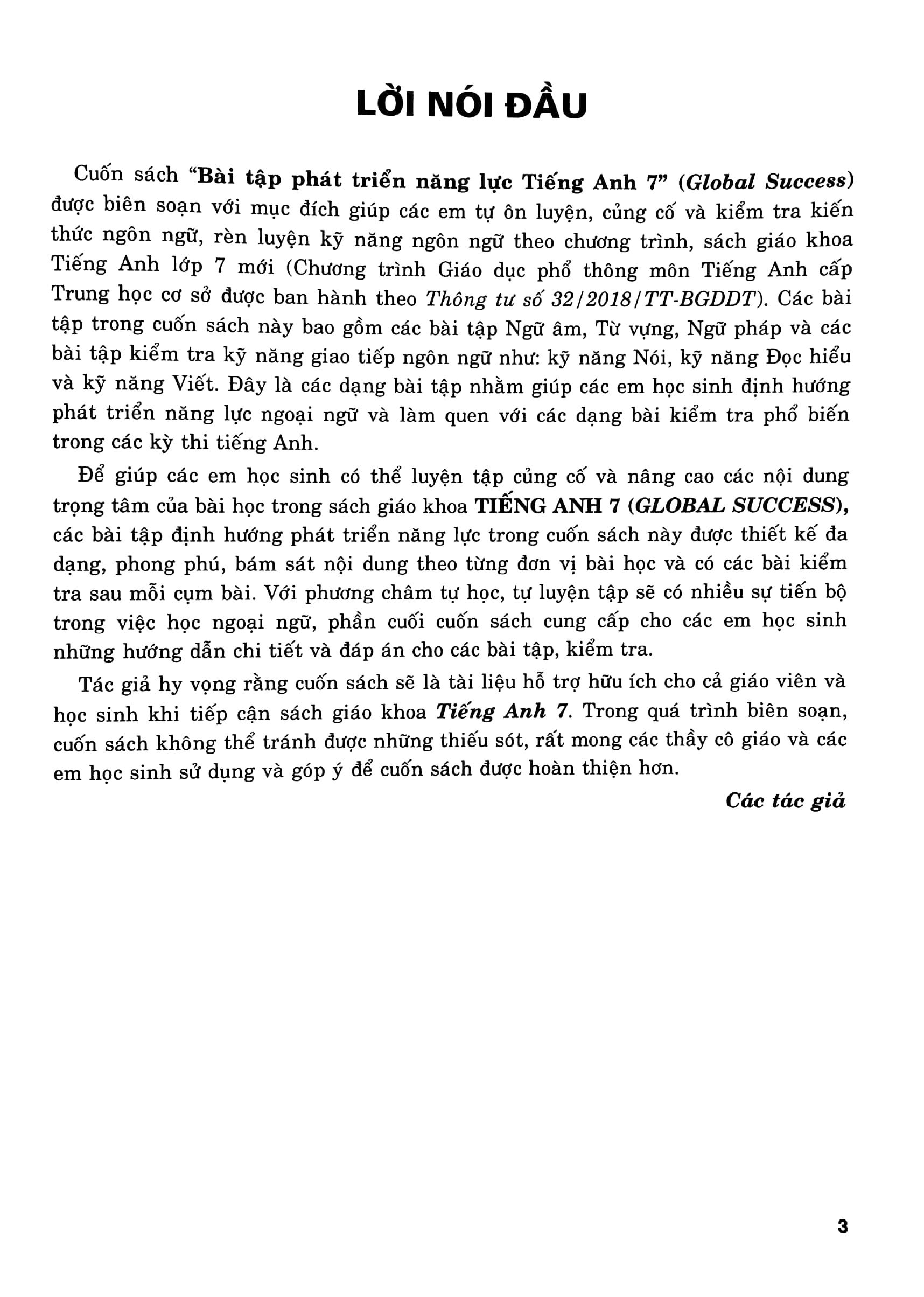 Cuốn sách “Bài tập phát triển năng lực Tiếng Anh 7” (Global Success) được biên soạn với mục đích giúp các em tự ôn luyện, củng cố và kiểm tra kiến thức ngôn ngữ, rèn luyện kỹ năng ngôn ngữ theo chương trình, sách giáo khoa Tiếng Anh lớp 7 mới (Chương trình Giáo dục phổ thông môn Tiếng Anh cấp Trung học cơ sở được ban hành theo Thông tư số 32/2018|TT-BGDDT). Các bài tập trong cuốn sách này bao gồm các bài tập Ngữ âm, Từ vựng, Ngữ pháp và các bài tập kiểm tra kỹ năng giao tiếp ngôn ngữ như: kỹ năng Nói, kỹ năng Đọc hiểu và kỹ năng Viết. Đây là các dạng bài tập nhằm giúp các em học sinh định hướng phát triển năng lực ngoại ngữ và làm quen với các dạng bài kiểm tra phổ biến trong các kỳ thi tiếng Anh.