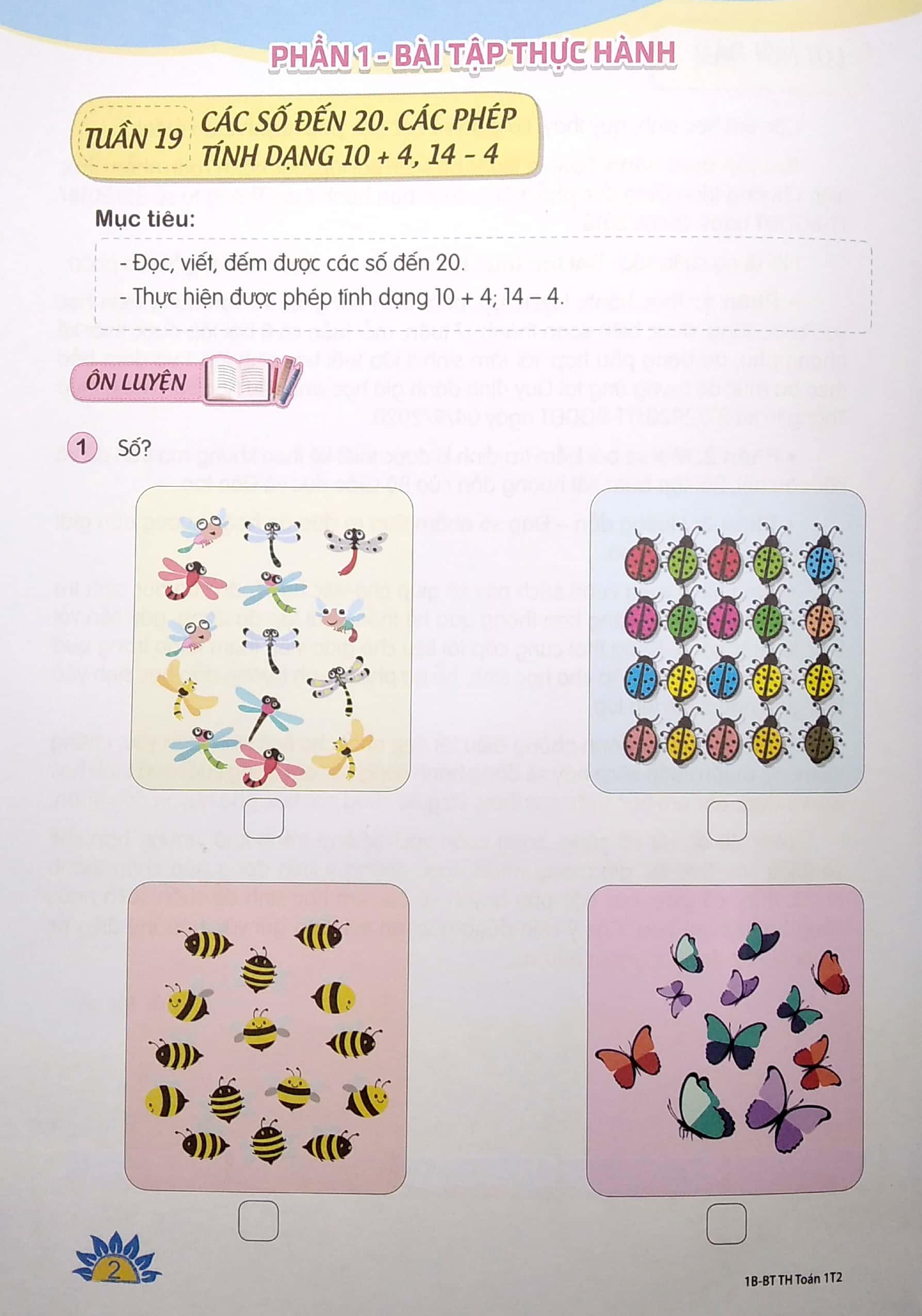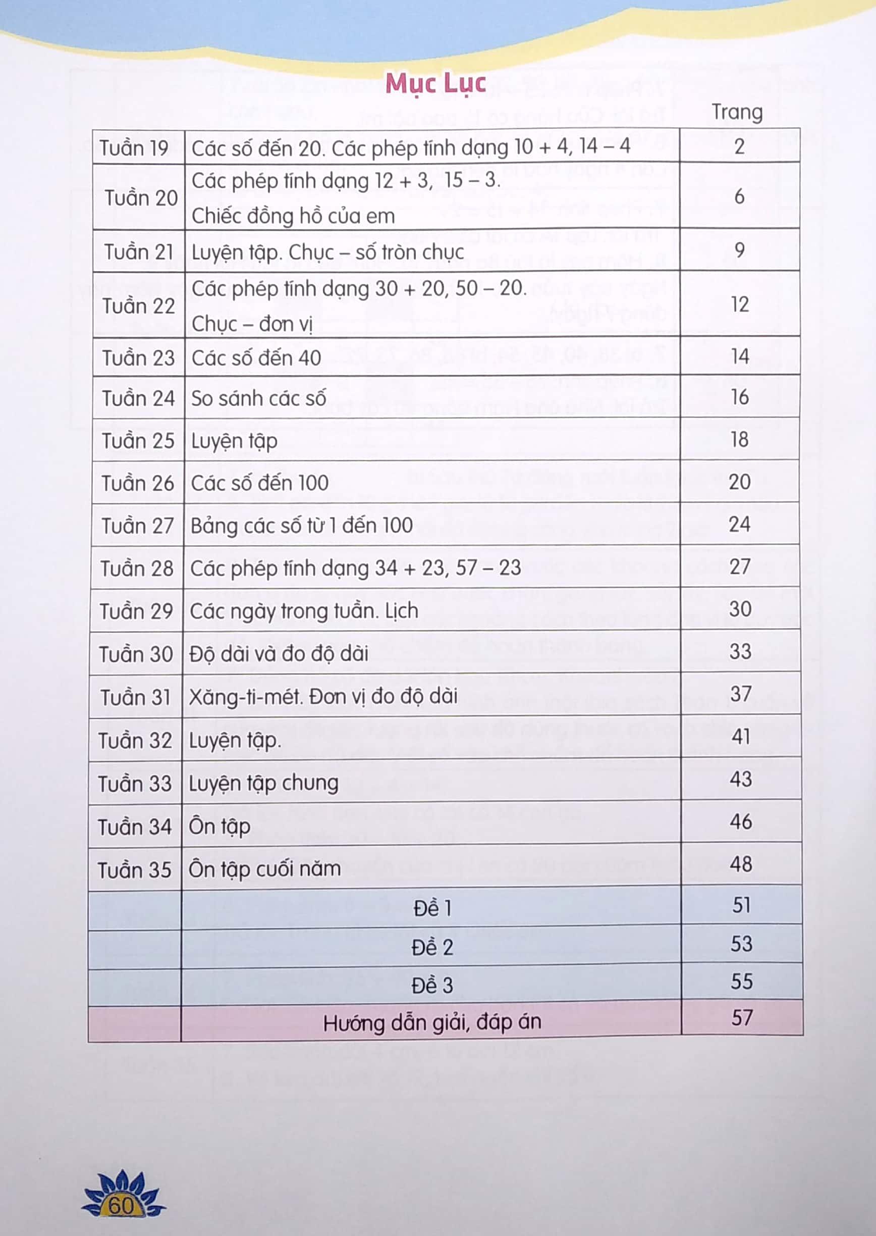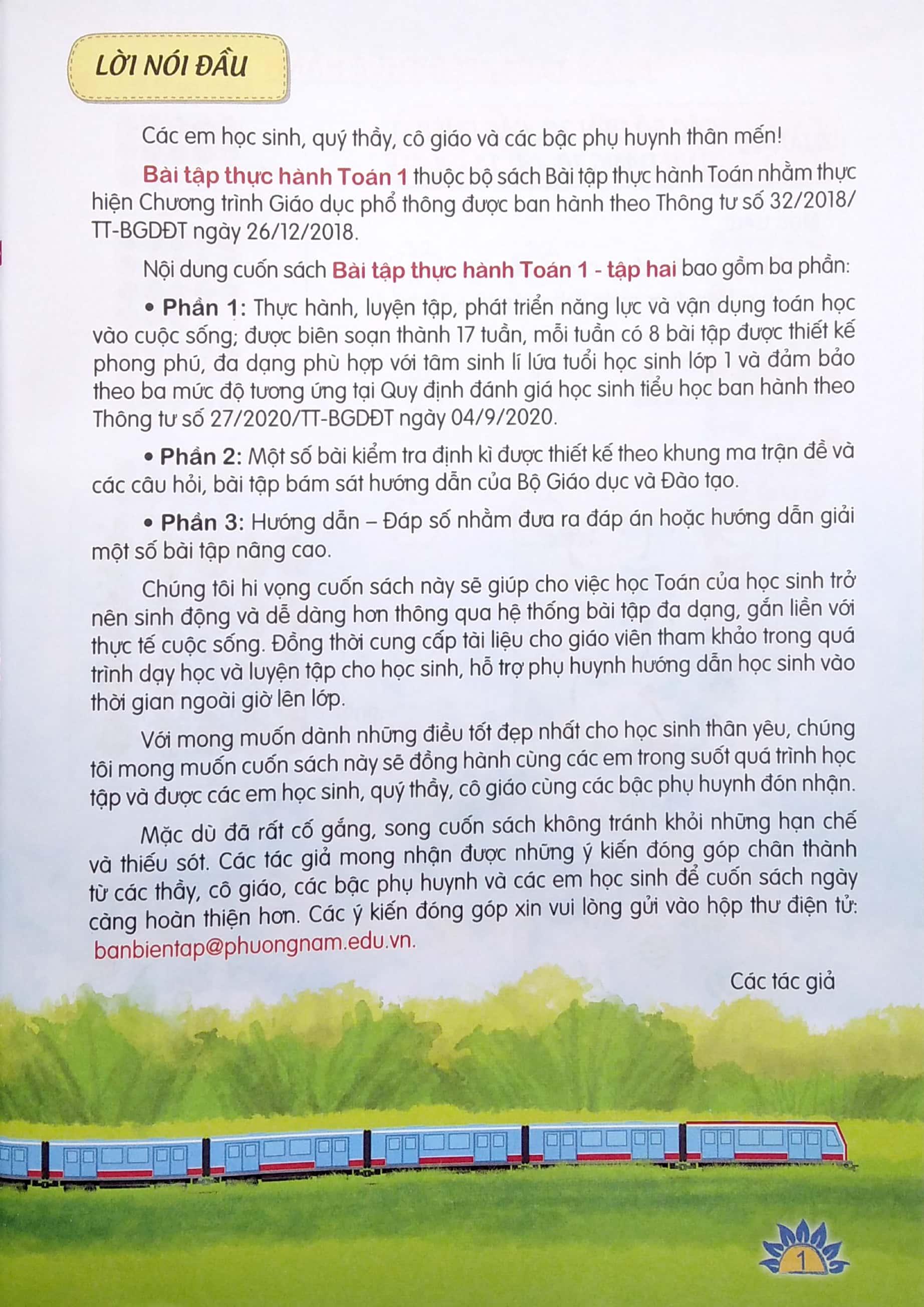 • Phần 1: Thực hành, luyện tập, phát triển năng lực và vận dụng toán học vào cuộc sống; được biên soạn thành 17 tuần, mỗi tuần có 8 bài tập được thiết kế phong phú, đa dạng phù hợp với tâm sinh lí lứa tuổi học sinh lớp 1 và đảm bảo theo ba mức độ tương ứng tại Quy định đánh giá học sinh tiểu học ban hành theo Thông tư số 27/2020/TT-BGDĐT ngày 04/9/2020.