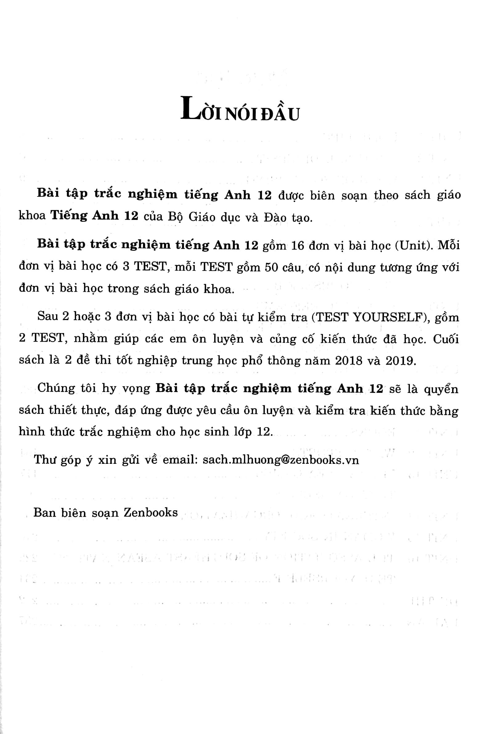 Chúng tôi hy vọng Bài tập trắc nghiệm tiếng Anh 12 sẽ là quyển sách thiết thực, đáp ứng được yêu cầu ôn luyện và kiểm tra kiến thức bằng hình thức trắc nghiệm cho học sinh lớp 12.