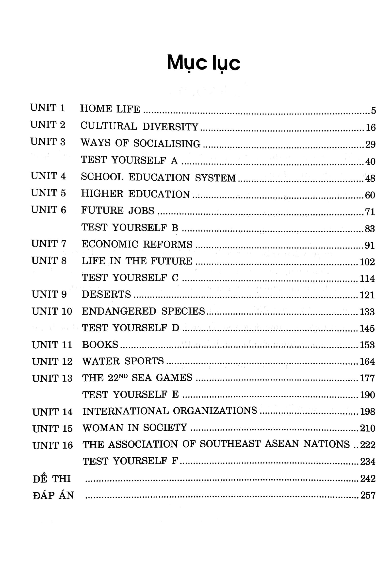 Sau 2 hoặc 3 đơn vị bài học có bài tự kiểm tra (TEST YOURSELF), gồm 2 TEST, nhằm giúp các em ôn luyện và củng cố kiến thức đã học. Cuối sách là 2 đề thi tốt nghiệp trung học phổ thông năm 2018 và 2019.