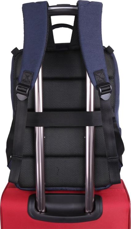 - Mặt lưng balo trang bị đai cố định vào cần kéo vali tiện lợi.