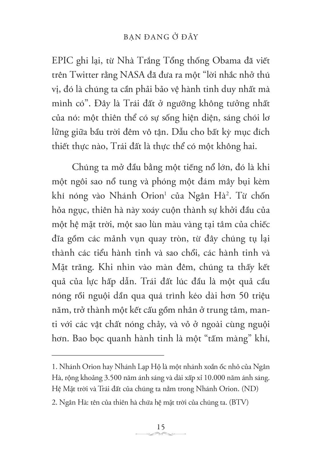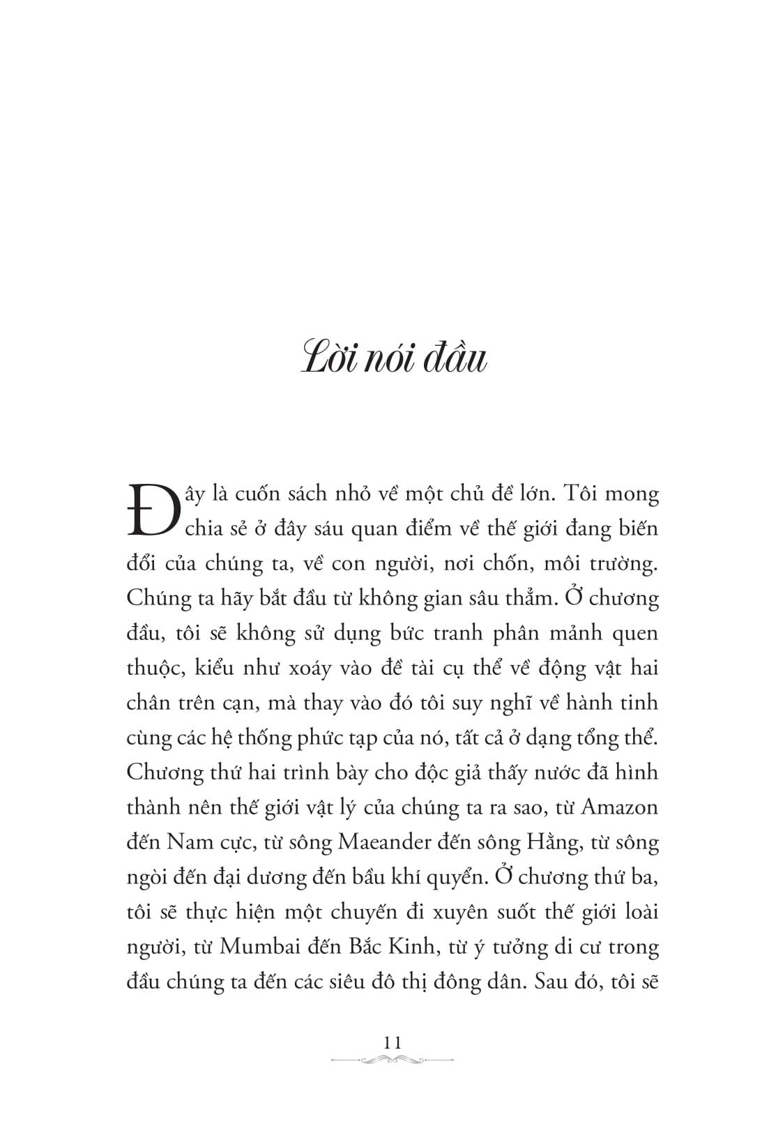 Chương 1: giới thiệu sơ về không gian, định vị Trái đất trong vũ trụ. “Ngành khoa học mô tả hành tinh nơi chúng ta đang sống chính là địa lý, “geography” – từ mà chúng ta thừa hưởng từ tiếng Hy Lạp – có nghĩa là “bản mô tả Trái đất”.”