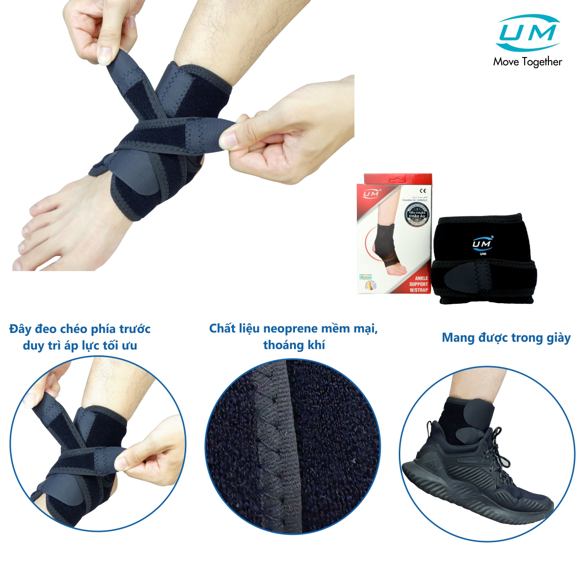 Băng mềm có dán chống lật cổ chân UM (D02) được sử dụng để hỗ trợ bong gân mắt cá chân cấp tính, thay thế cho băng. Sản phẩm này cũng thích hợp để hỗ trợ chứng mất ổn định mắt cá chân mãn tính. Thiết kế dạng dây đeo chéo phía trước, giúp duy trì áp lực tối ưu. Chất liệu neoprene cao cấp. Kiểu dáng đơn giản, dễ sử dụng.
