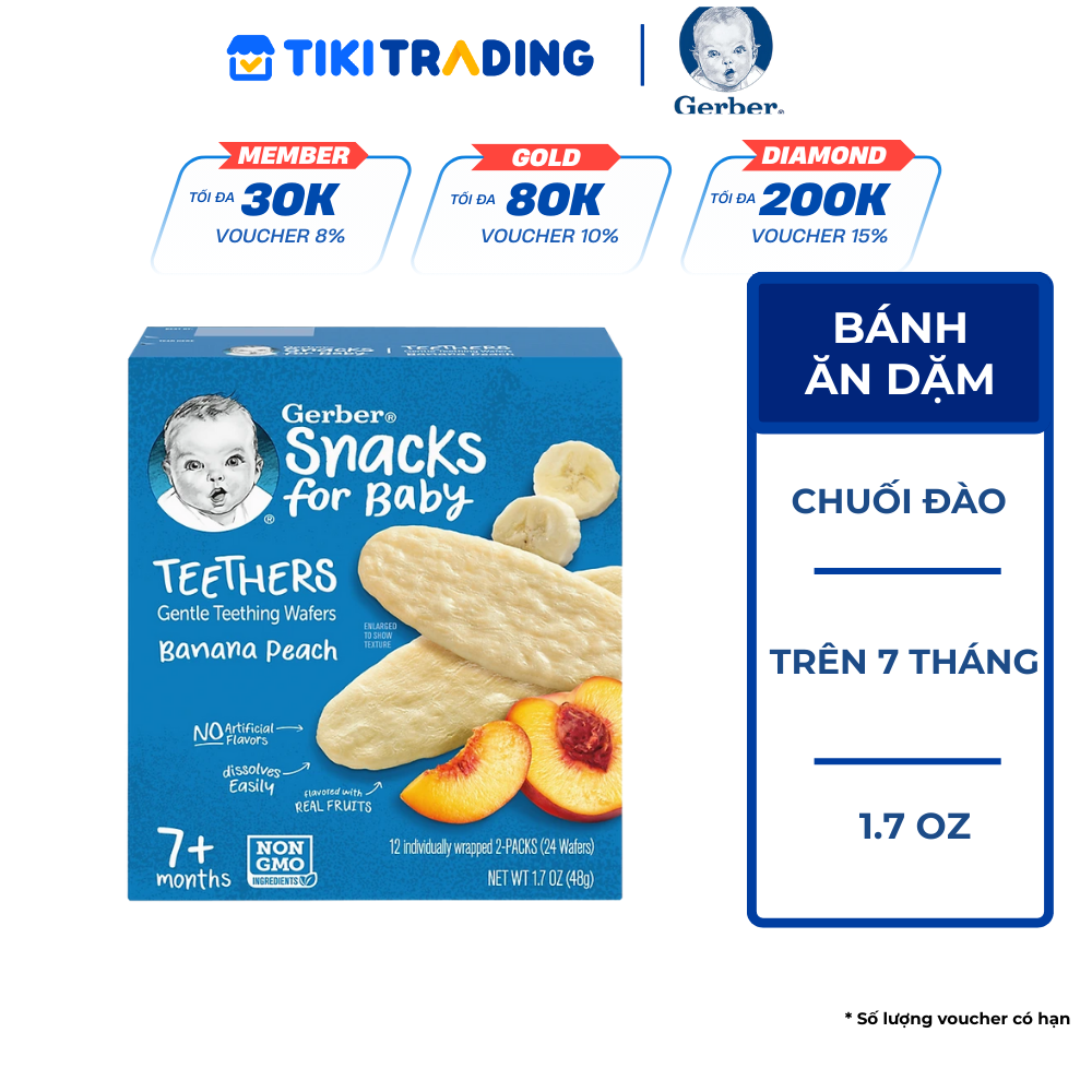 - Bánh gạo Gerber vị chuối đào là một trong những loại bánh ăn dặm được các mẹ tin dùng cho bé yêu từ 7 tháng tuổi trở lên. Với hương vị thơm ngon của chuối và đào, kết hợp cùng kết cấu mềm xốp, bánh gạo Gerber không chỉ cung cấp dinh dưỡng cần thiết mà còn giúp bé làm quen với việc ăn dặm một cách dễ dàng và thích thú.
