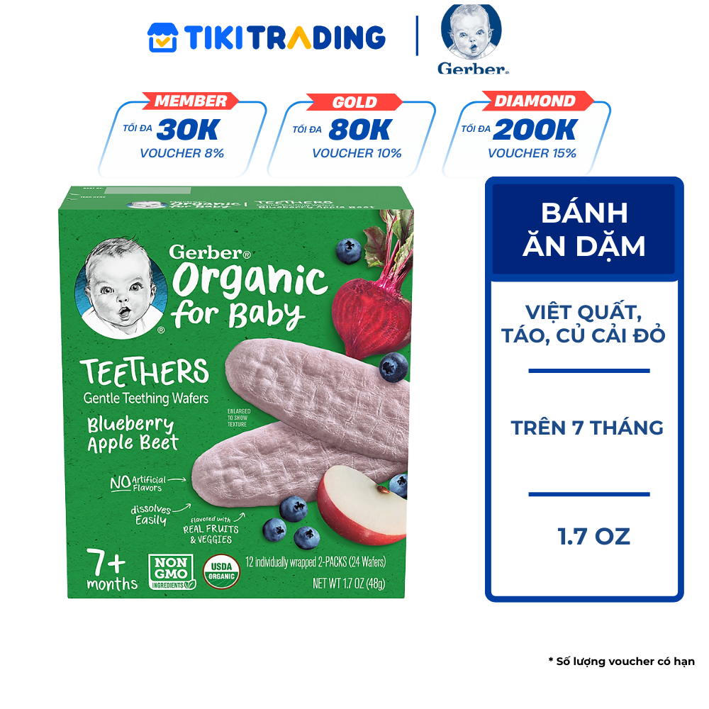 - Bánh gạo Gerber Organic là lựa chọn hoàn hảo cho bé từ 7 tháng tuổi trở lên. Với hương vị thơm ngon từ việt quất, táo và củ cải đỏ, bánh giúp bé làm quen với các loại thức ăn mới, kích thích vị giác và tăng cường khả năng nhai.
