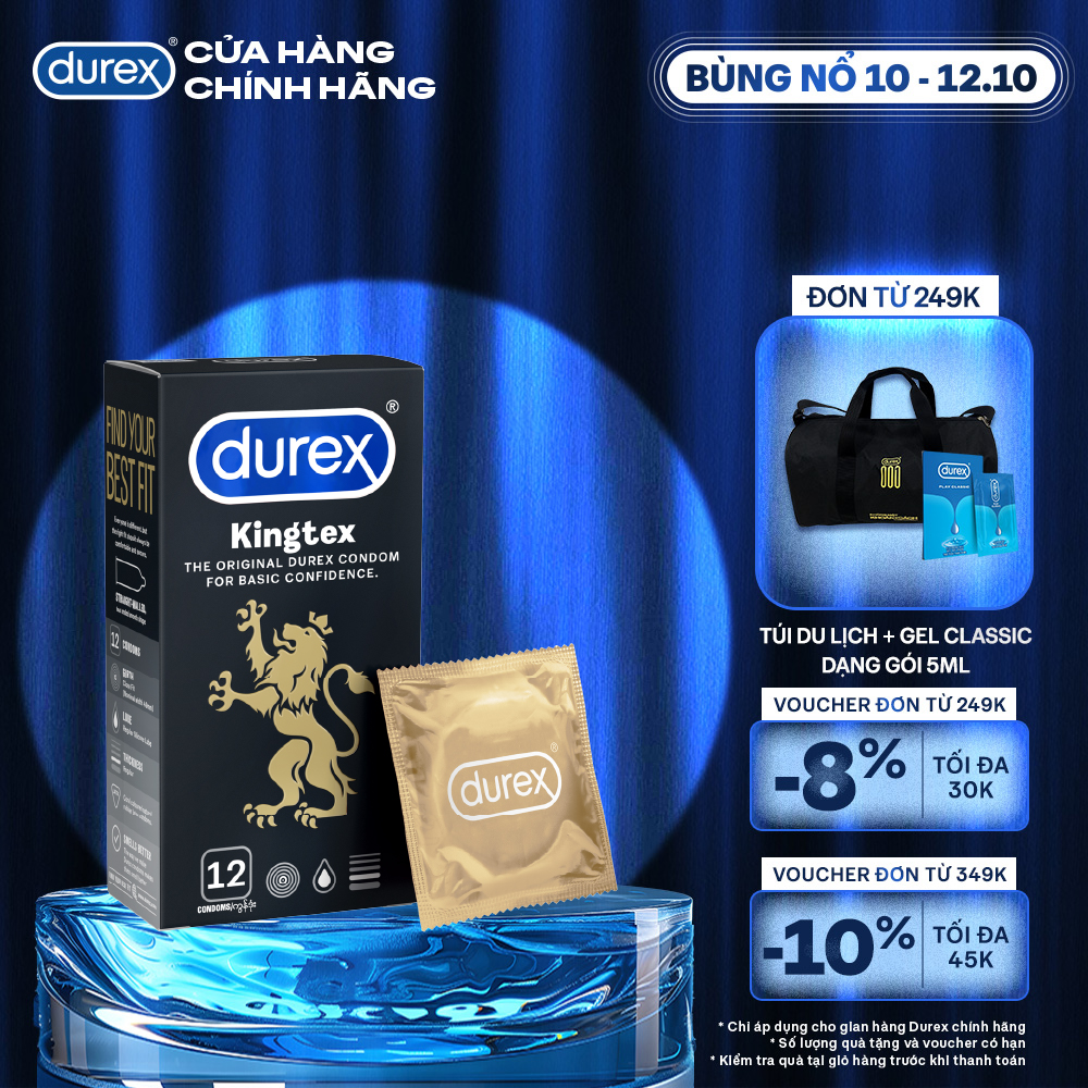 - Bao cao su Durex Kingtex có thành bao láng mịn, kiểu dáng thẳng, dễ mang vào.
