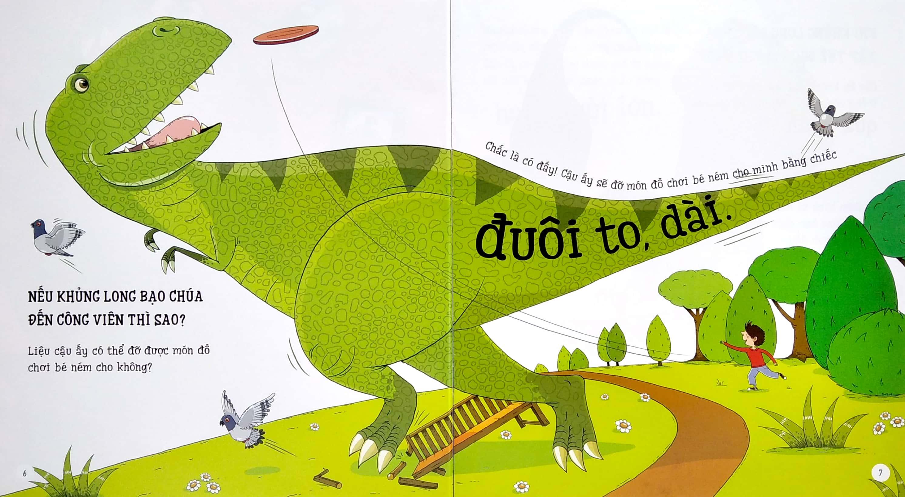 - Nế khủng long bạo chúa dạo chơi trong thành phố: Hãy tưởng tượng, nếu khủng long bạo chúa còn sống tới ngày nay, chắc chắn, bé sẽ vô cùng bất ngờ khi phát hiện ra cậu ấy: có thể nuốt gọn 2.000 chiếc bánh mì kẹp thịt, có những chiếc răng to bằng cả quả chuối, có thể nghiền được cả đống rác chỉ trong chớp mắt… Và còn bao nhiêu điều kinh ngạc khác về khủng long bạo chúa đang chờ bé khám phá!