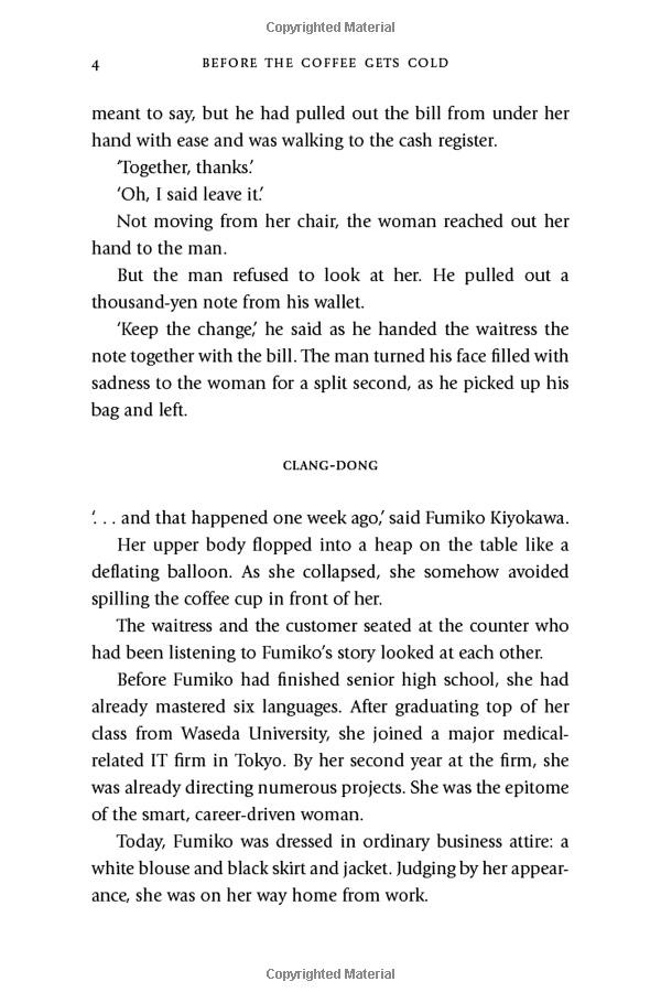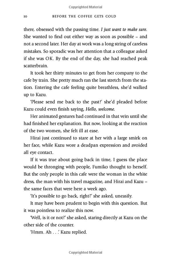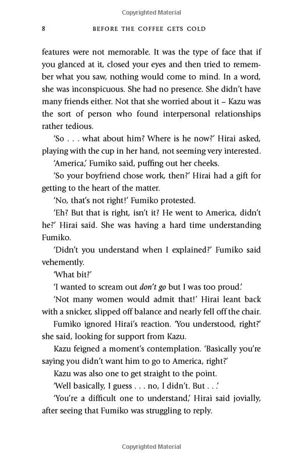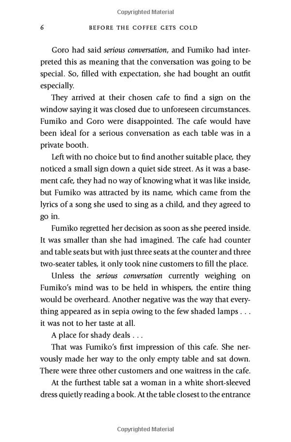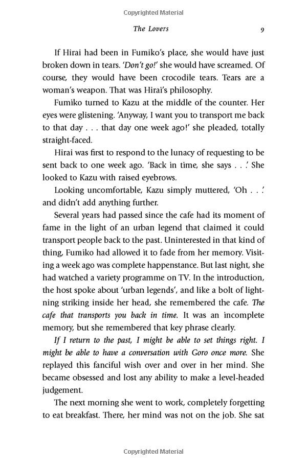 But the journey into the past does not come without risks: customers must sit in a particular seat, they cannot leave the café, and finally, they must return to the present before the coffee gets cold . . .