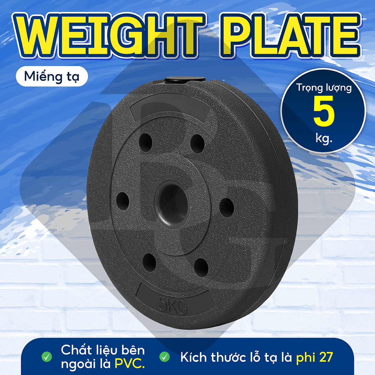 - Tạ miếng nhựa có vỏ ngoài là nhựa cứng cao cấp, ruột gồm cát và xi măng.