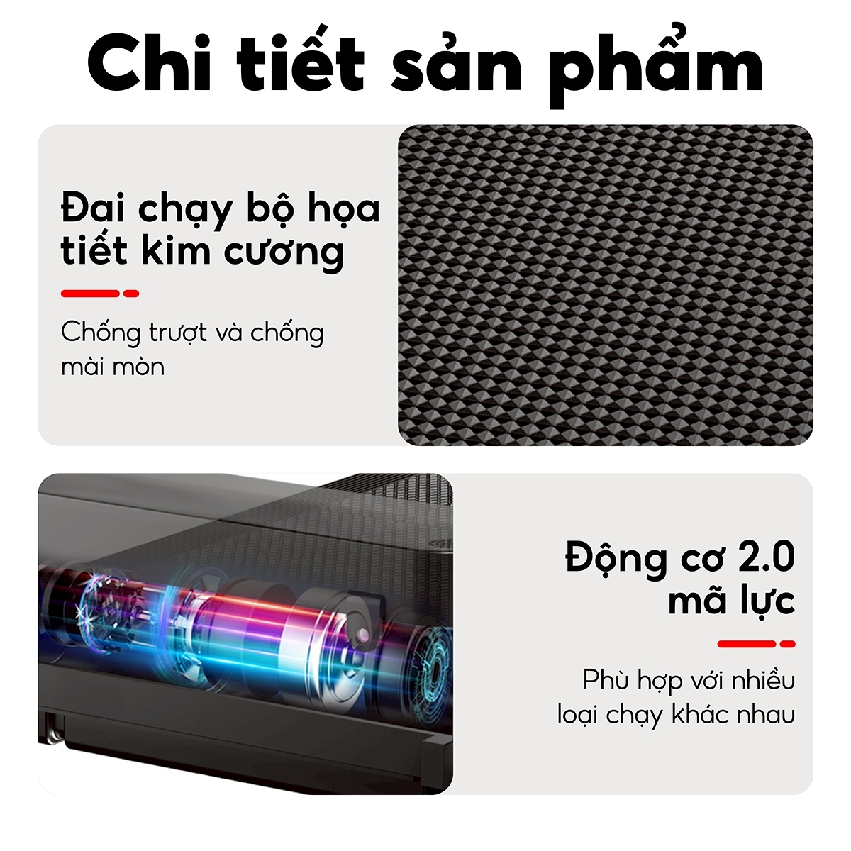 - Băng chạy EVA chống rung tản lực tốt, hấp thụ bớt phản lực tác động lên khớp gối, giúp khớp gối mạnh khỏe hơn.