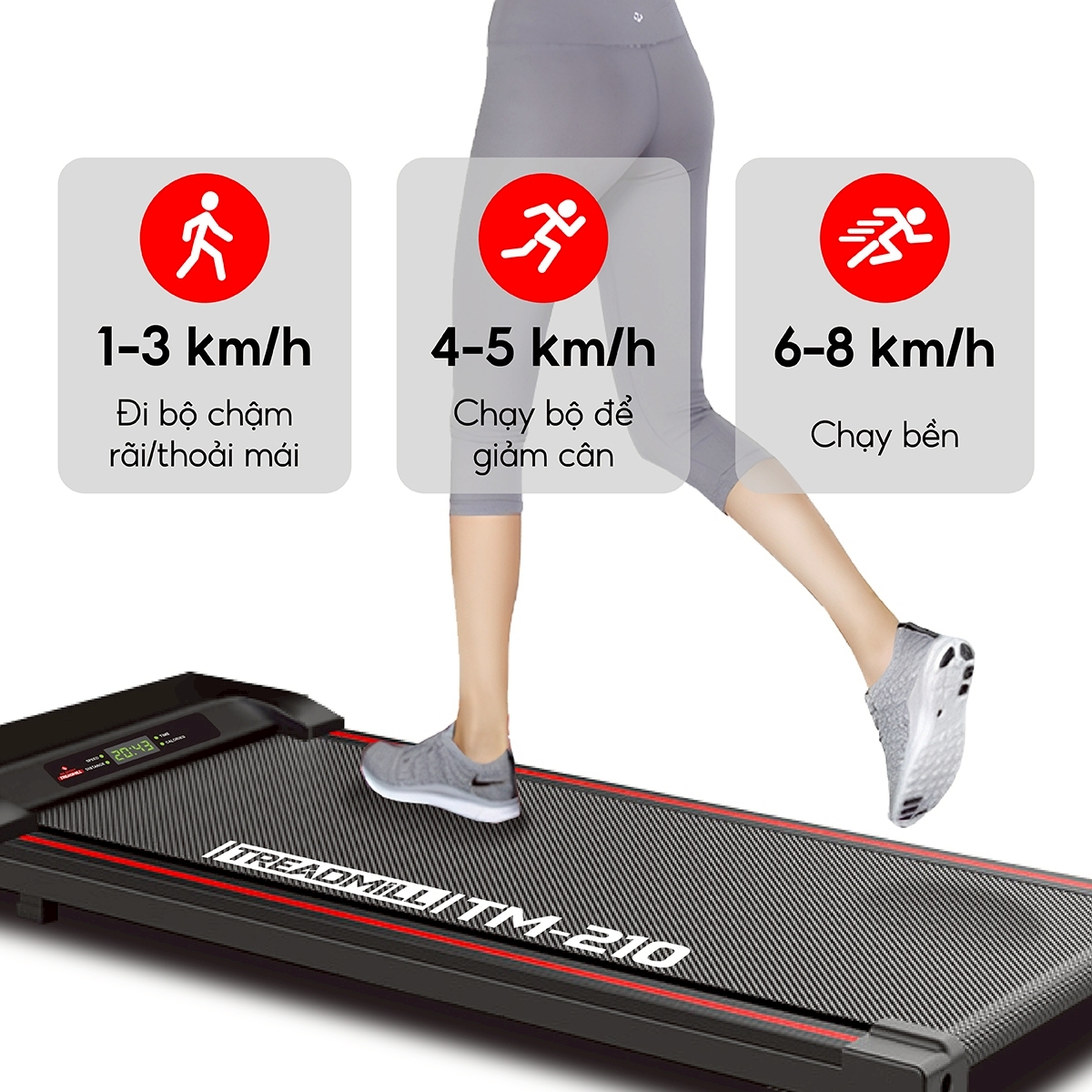 - Máy đi bộ trong nhà, có thể chỉnh tốc độ khoảng 1-6KM/h, phù hợp cho mọi đối tượng: Người già đi bộ chậm sau bữa cơm, trẻ em đi bộ tăng vận động, ba mẹ đi bộ thư giãn sau giờ là