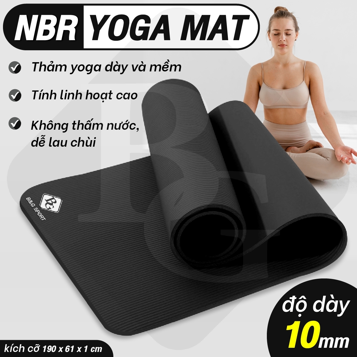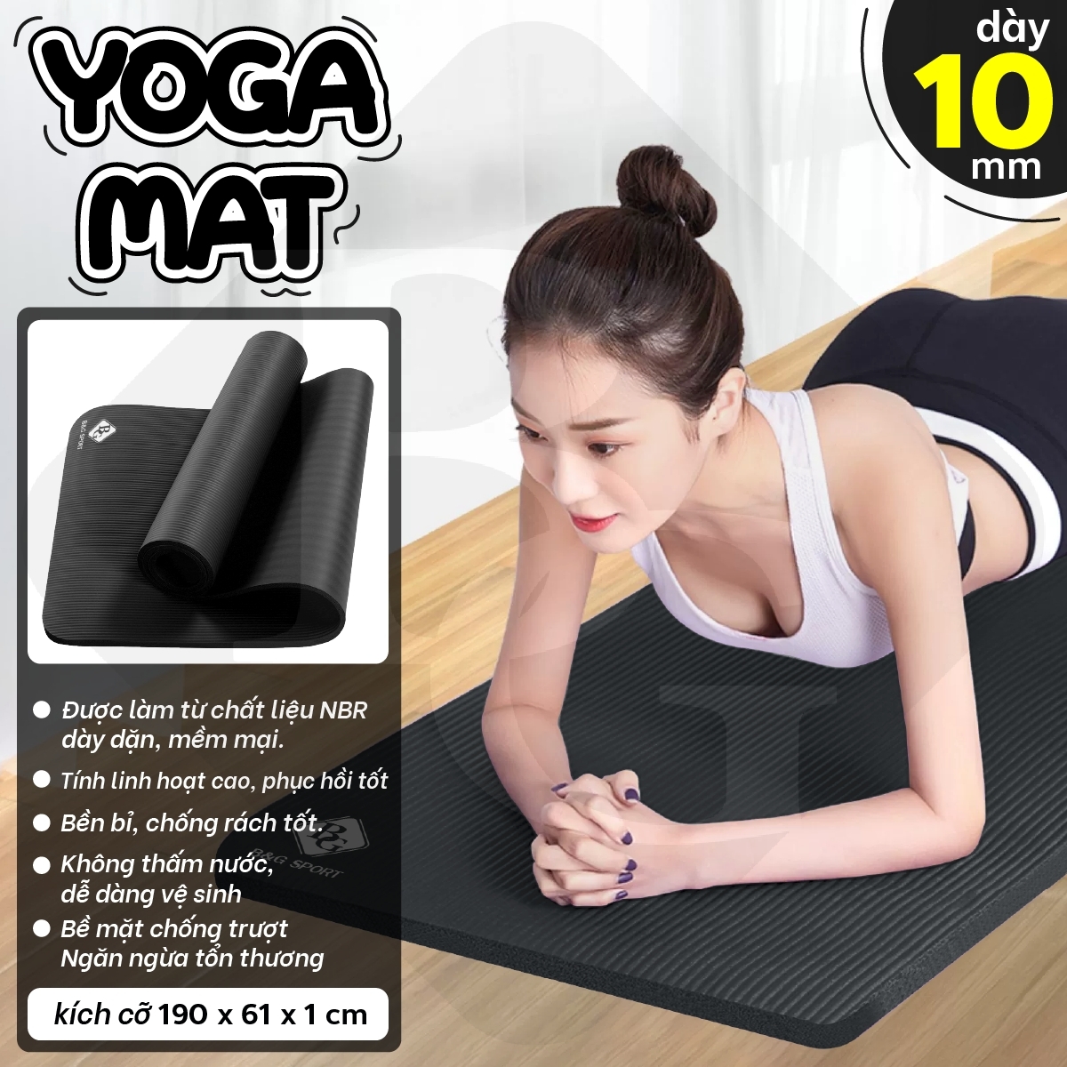 Thông số kỹ thuật BG Thảm tập Yoga,GYM chuyên dụng dày 10mm cao su NBR nguyên khối, độ đài hồi tốt, chống lún, Chống trơn trượt, độ bám cao, ngăn ngừa hôi và ẩm mốc (hàng nhập khẩu)
