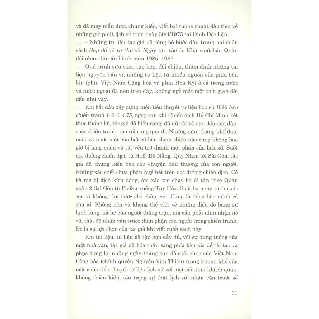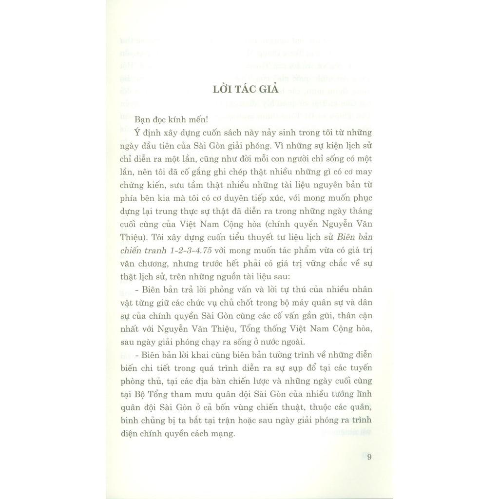 Biên bản chiến tranh 1-2-3-4.75 (Tái bản lần thứ năm, có bổ sung) gồm 19 chương nội dung tác phẩm và phần phụ lục gồm 31 tài liệu tham khảo nguyên bản được in toàn văn đã phục dựng một cách trung thực, sinh động sự sụp đổ cùng chân dung của hầu hết tướng lĩnh quân đội và số phận những người cầm đầu chính quyền tay sai Sài Gòn trong bốn tháng cuối cùng của chiến tranh giải phóng miền Nam (từ tháng 01 đến hết tháng 4/1975), làm nổi bật chiến thắng vĩ đại của cuộc kháng chiến chống Mỹ, cứu nước của quân và dân ta dưới sự lãnh đạo sáng suốt và tài tình của Đảng Cộng sản Việt Nam.