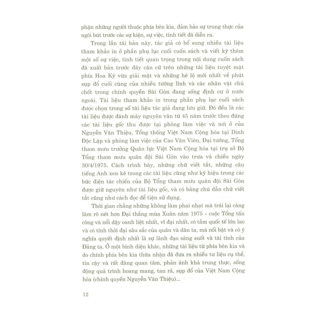 Về nội dung bổ sung thứ nhất, theo Lời Nhà xuất bản, kể từ lần xuất bản đầu tiên (tháng 4/2014) đến nay đã 6 năm. Trong thời gian đó, xuất hiện thêm một số tài liệu tuyệt mật được phía Hoa Kỳ giải mật; một số sự kiện, sự việc, tình tiết quan trọng trong giờ phút sụp đổ cuối cùng được các tướng lĩnh và các nhân vật chủ chốt trong chính quyền Sài Gòn đang sống và định cư ở nước ngoài tiếp tục hé lộ. Những chi tiết đắt giá, tin cậy đã được chọn lọc để bổ sung cho nội dung xuất bản trước đó, giúp tác phẩm thêm phần đầy đủ, sinh động, hấp dẫn, phục vụ tốt nhu cầu bạn đọc.