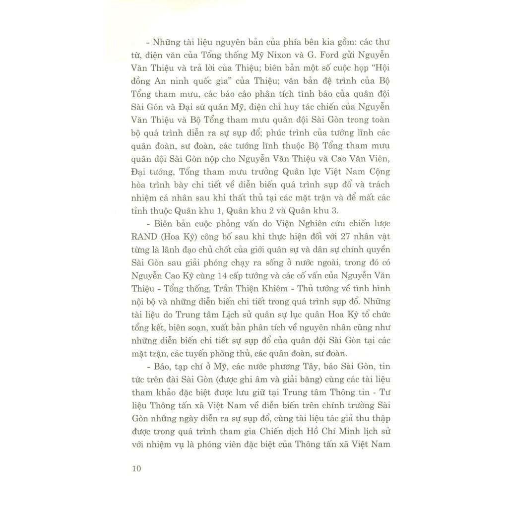 31 tài liệu tham khảo đặc biệt hầu hết là các tài liệu thu được tại bàn làm việc và nơi ở của Nguyễn Văn Thiệu, Tổng thống Việt Nam Cộng hòa tại Dinh Độc Lập và tại phòng làm việc của Cao Văn Viên, Đại tướng, Tổng tham mưu trưởng Quân lực Việt Nam Cộng hòa tại trụ sở Bộ Tổng tham mưu quân đội Sài Gòn vào buổi trưa và chiều tối ngày 30/4/1975. Với tư cách là phóng viên Thông tấn xã Việt Nam tham gia Chiến dịch Hồ Chí Minh, trực tiếp chứng kiến và viết bài tường thuật đầu tiên về những giờ phút lịch sử trưa 30/4/1975 tại Dinh Độc Lập, nhờ sự giúp đỡ của các cơ quan có thẩm quyền trong và ngoài quân đội cùng cơ may lịch sử, cơ duyên cuộc sống, tác giả đã may mắn tiếp cận, khai thác được những tài liệu quý giá trên đây và lưu giữ tới nay.