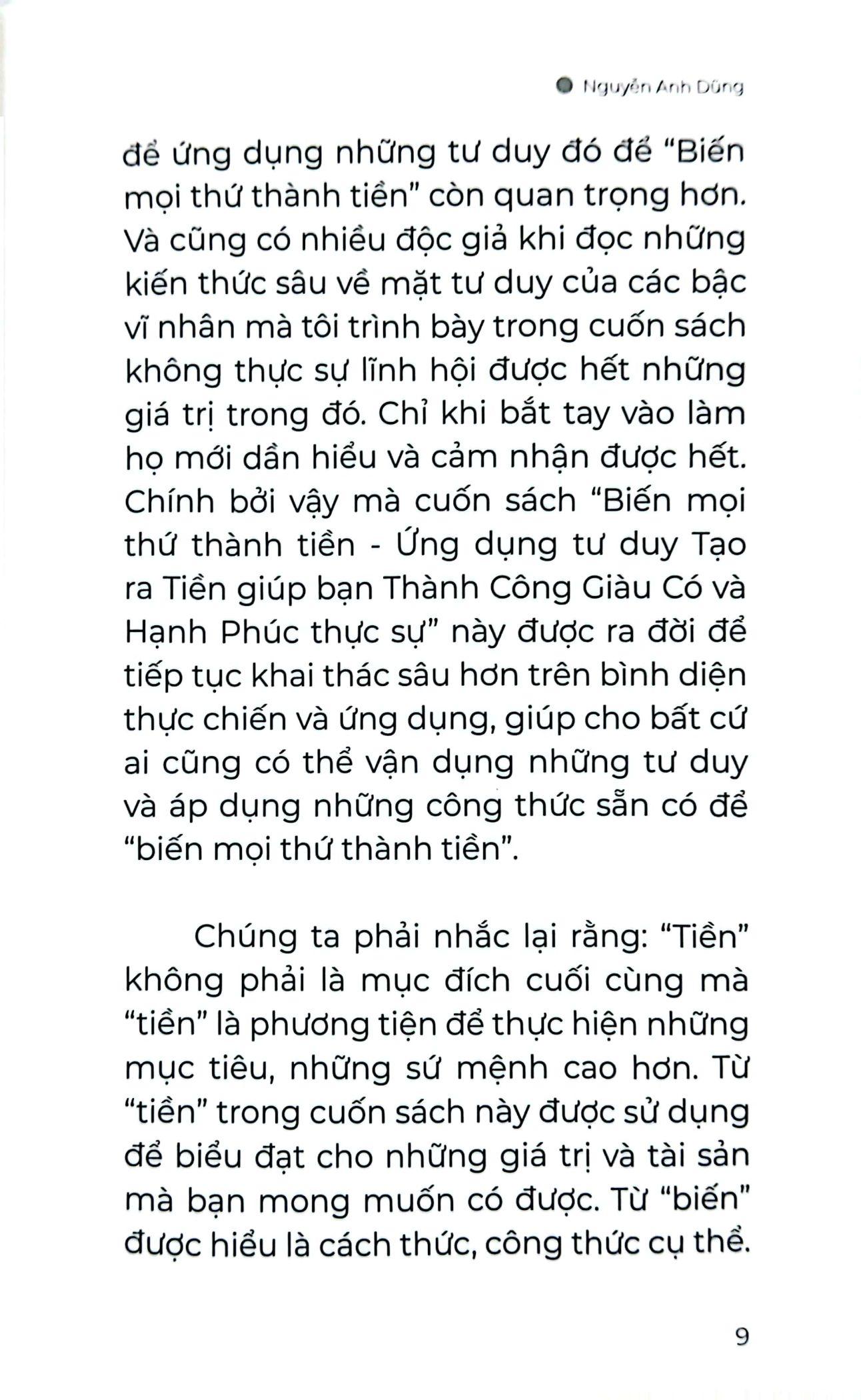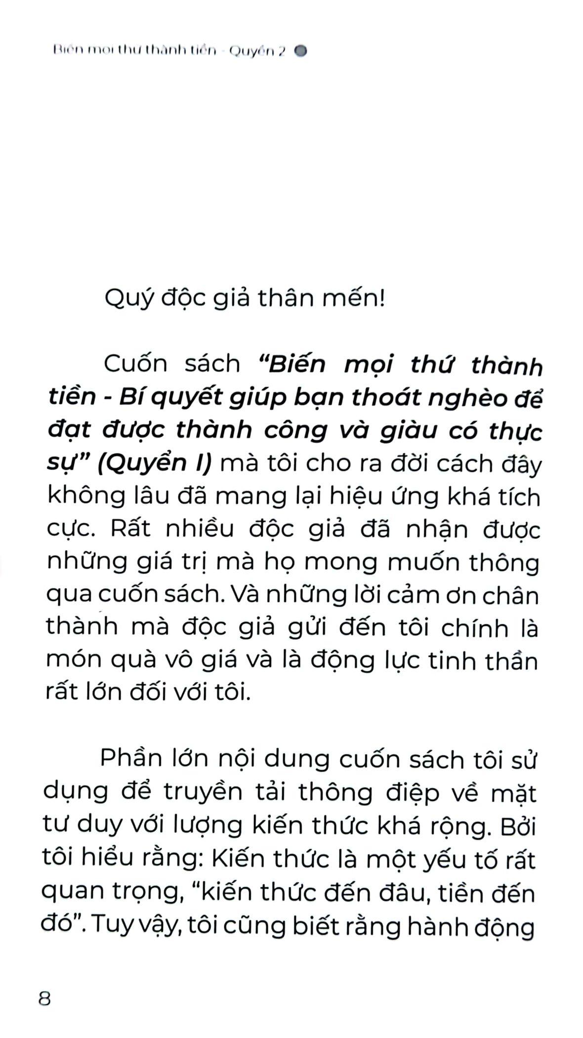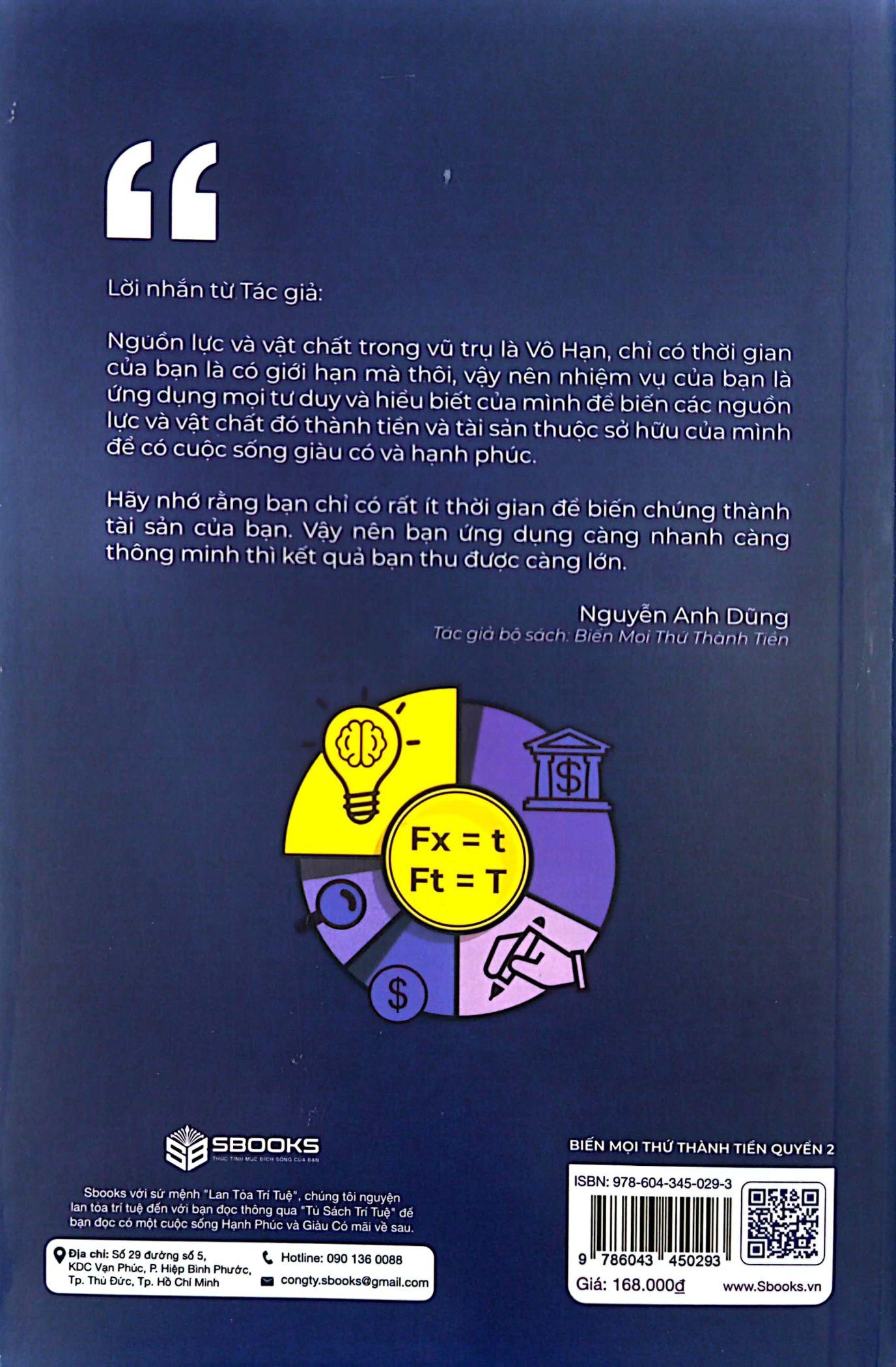 Cuốn sách BIẾN MỌI THỨ THÀNH TIỀN - QUYỂN 2 - Ứng dụng tư duy Tạo ra Tiền giúp bạn Thành Công Giàu Có và Hạnh Phúc thực sự là một trong những cuốn sách thuộc bộ BIẾN MỌI THỨ THÀNH TIỀN của tác giả Nguyễn Anh Dũng - Nhà sáng lập Sbooks. Trong cuốn sách này chứa đựng sự sâu sắc nhưng cũng rất mới mẻ và lôi cuốn bởi nó được tạo nên bởi hệ thống giá trị tư duy độc đáo và khác biệt. Cuốn sách không đơn thuần là một cuốn sách chỉ cách kiếm tiền, mà còn là một cuốn cẩm nang về tư duy, chiến lược mang tầm vĩ mô, có thể ứng dụng trong hàng chục thậm chí hàng trăm năm trong mọi lĩnh vực của cuộc sống. Bởi đó là việc ứng dụng các quy luật tự nhiên, xã hội gắn liền với tinh thần trách nhiệm và lòng trắc ẩn nhằm đưa xã hội phát triển theo quy luật chung. Cuốn sách dành cho bất cứ ai, ở bất cứ đâu, làm bất cứ lĩnh vực gì, quy mô lớn hay nhỏ đều có thể dễ dàng áp dụng và tạo ra không chỉ tiền mà còn là thành công, hạnh phúc, và những đóng góp, trả ơn cho xã hội, cộng đồng. Hãy sở hữu cuốn sách này càng sớm càng tốt bởi nó chắc chắn sẽ mang lại cho bạn giá trị gấp nhiều lần ngay khi bạn lật mở những trang đầu tiên!