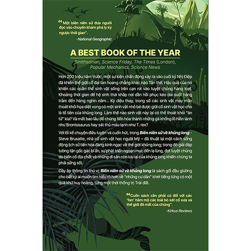 Với lối kể chuyện điêu luyện và cuốn hút, trong Biên niên sử về khủng long, Steve Brusatte – nhà cổ sinh vật học người Mỹ – đã thuật lại một cách sống động lịch sử tiến hóa đáng kinh ngạc về thế giới khủng long; trong đó giải đáp tường tận gốc gác bí ẩn, sự phát triển ngoạn mục đến lạ lùng, đợt tuyệt chủng do biến cố địa chất và những di sản còn lưu lại của khủng long khiến chúng ta phải sửng sốt. Biên niên sử về khủng long sẽ là sách gối đầu giường cho bất kỳ ai muốn tìm hiểu rõ hơn về “những cư dân” khét tiếng từng có một quá khứ huy hoàng, từng một thời thống trị Trái đất.