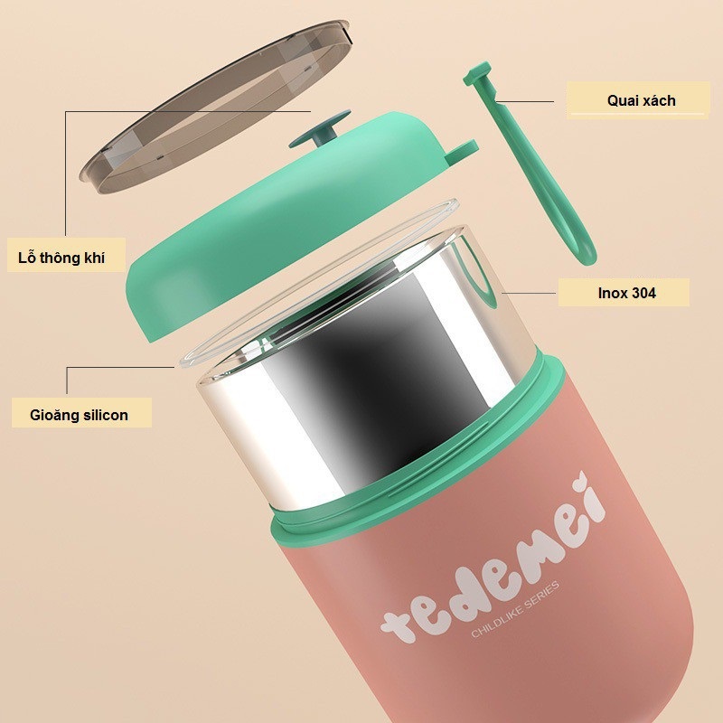 Thông số kỹ thuật Bình Ủ Cháo Inox 304 Giữ Nhiệt Tedemei Có Thìa Và Quai Dung Tích 530ml