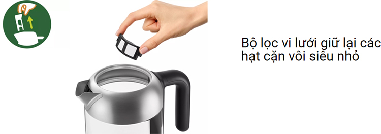 Bộ lọc vi lưới có thể tháo rời nằm trên vòi có tác dụng trong việc giữ lại các hạt cặn vôi siêu nhỏ cỡ 200 micrômét để đảm bảo nước được rót vào cốc là nước sạch.