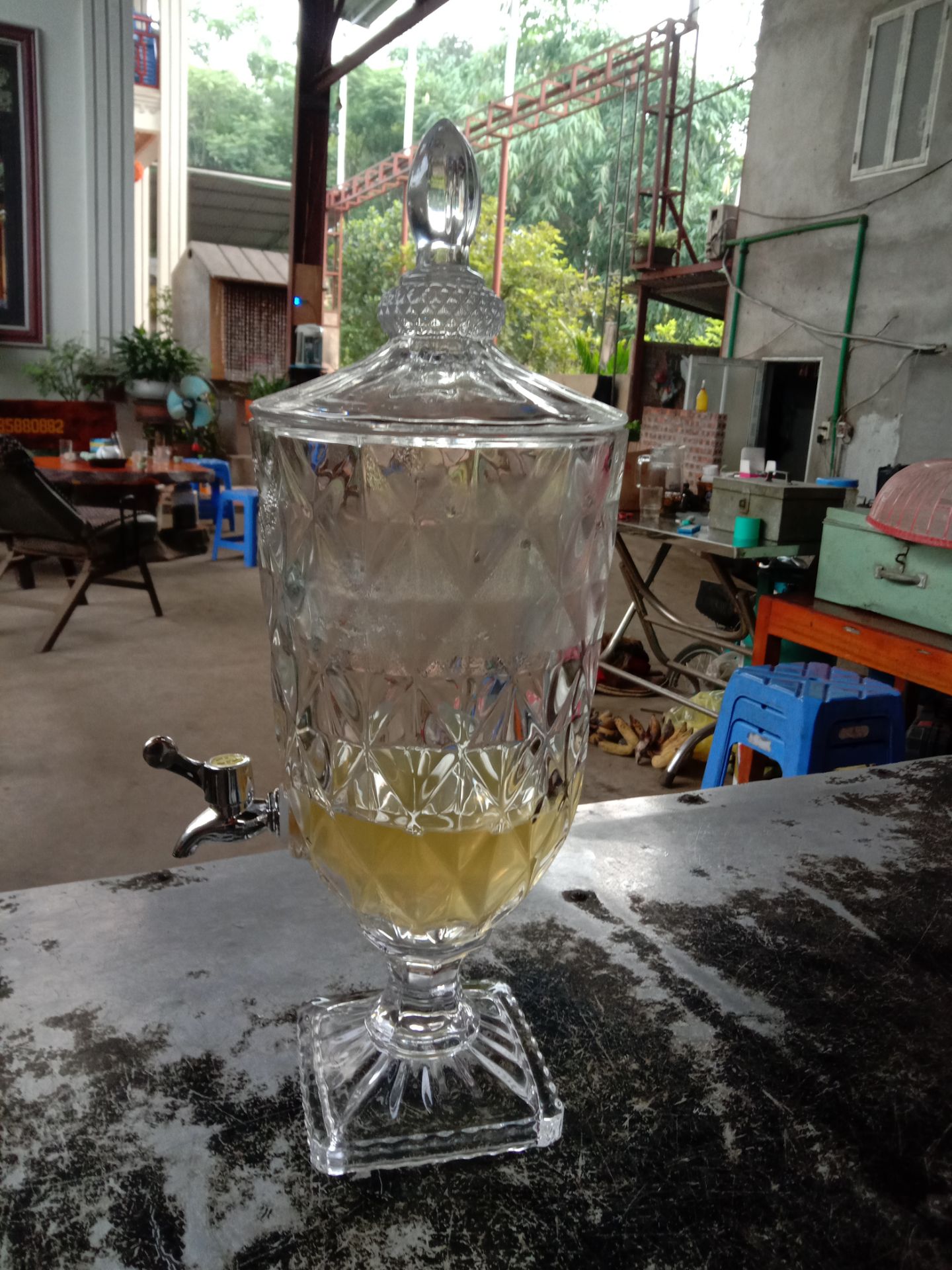 - Đây là một trong những Bình thủy tinh có kiểu dáng đẹp, lạ, độc đáo nhất trong bộ sưu tập. Có thể vừa để ngâm hoa quả, vừa để trang trí nội thất gia chủ.