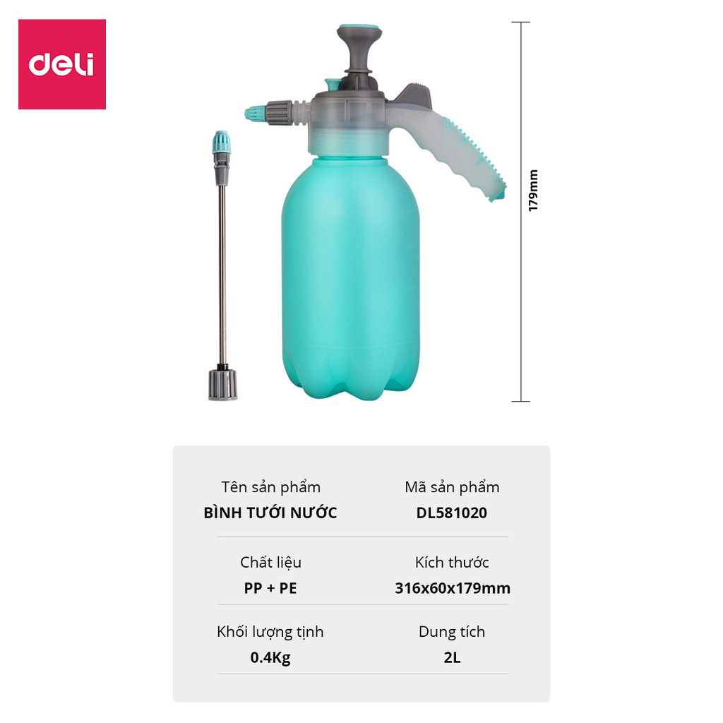 Thông số kỹ thuật Bình Xịt Tưới Cây Deli 2 Lít, 2 Vòi Dài / Ngắn Tiện Dụng, Phun Sương Tưới Cây Cảnh, Làm Vườn, Chất Liệu An Toàn DL581020