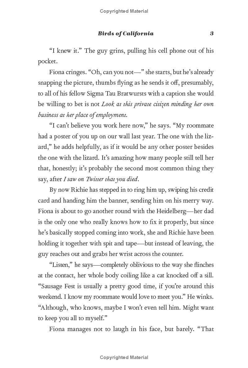 Unlike Fiona, Sam Fox, who played her older brother on the popular television show Birds of California, loves the perks that come with being a successful Hollywood actor: fame, women, parties, money. When his current show gets cancelled and his agent starts to avoid his calls, the desperate actor enthusiastically signs on for a Birds of California revival. But to make it happen, he needs Fiona St. James.