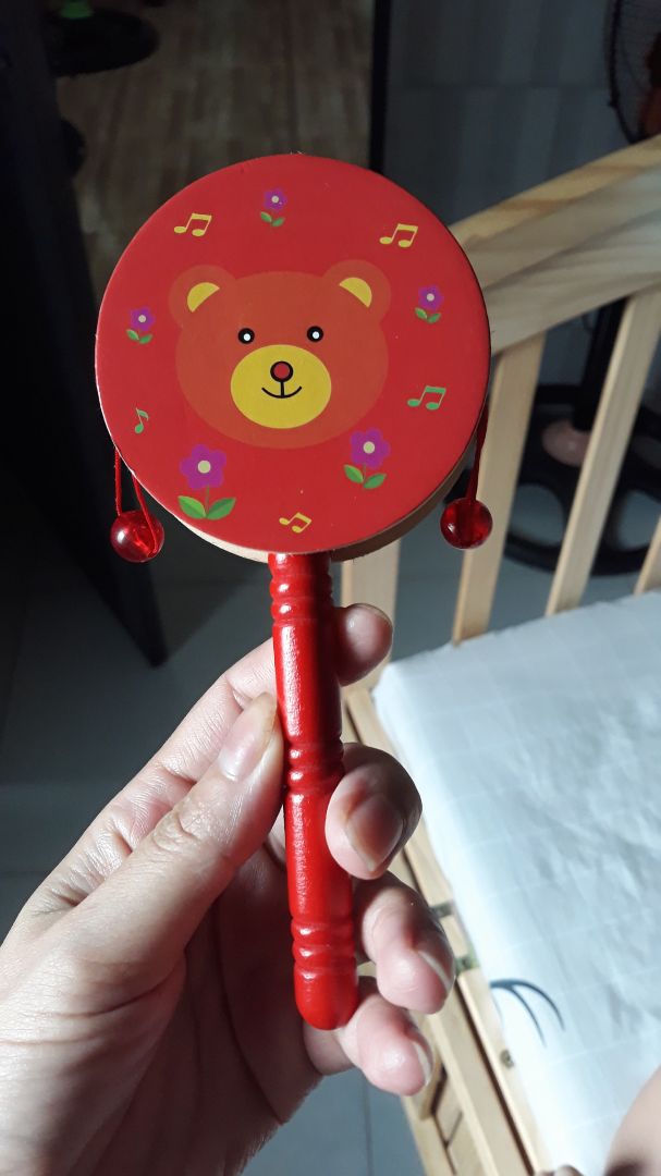 Với các bé từ 3 tháng tuổi trở lên thì các món đồ chơi lục lạc hay xúc xắc là những món đồ chơi rất cần thiết cho các bé tập cầm nắm và cảm thụ âm thanh. Bởi trong giai đoạn này bé bắt đầu tương tác nhiều hơn với các sự vật và sự việc xung quanh, những món đồ chơi nhiều màu sắc và phát ra âm thanh vui tai sẽ rất dễ thu hút bé. Đồ chơi gỗ trống lắc cầm tay là loại đồ chơi mô hình nhạc cụ phát ra âm thanh vui tai khi bé cầm lắc thì 2 hạt tròn có buộc dây đập vào mặt trống tạo ra tiếng kêu với thiết kế mặt trống hình tròn họa tiết dễ thương, màu sắc tươi sáng, chất liệu an toàn được sản xuất tại Việt Nam, chắc chắn đây sẽ là món đồ chơi trống lắc cầm tay cho bé được các mẹ yêu thích.