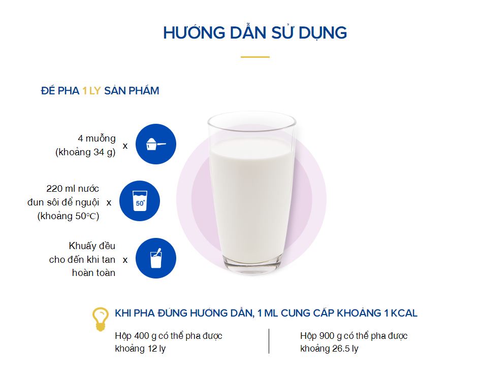 | Giá trị dinh dưỡng trung bình | Trong 100g bột | Trong 1 ly đã pha | Đơn vị |