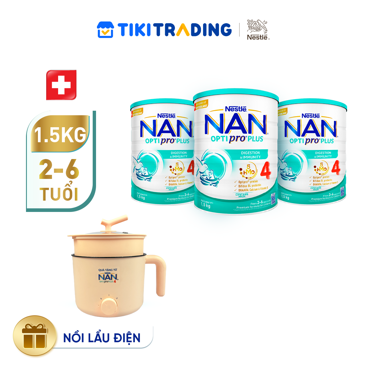 Thông số kỹ thuật Bộ 3 Lon Sữa bột Nestlé NAN OPTIPRO PLUS 4 1500g/lon Giúp tiêu hóa tốt + Tăng cường đề kháng (2 - 6 tuổi) - Tặng Nồi lẩu điện A2