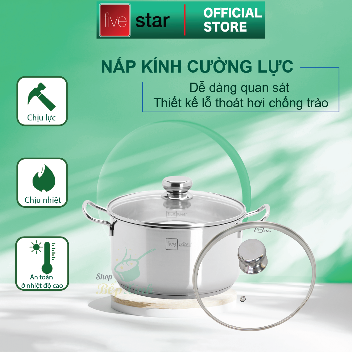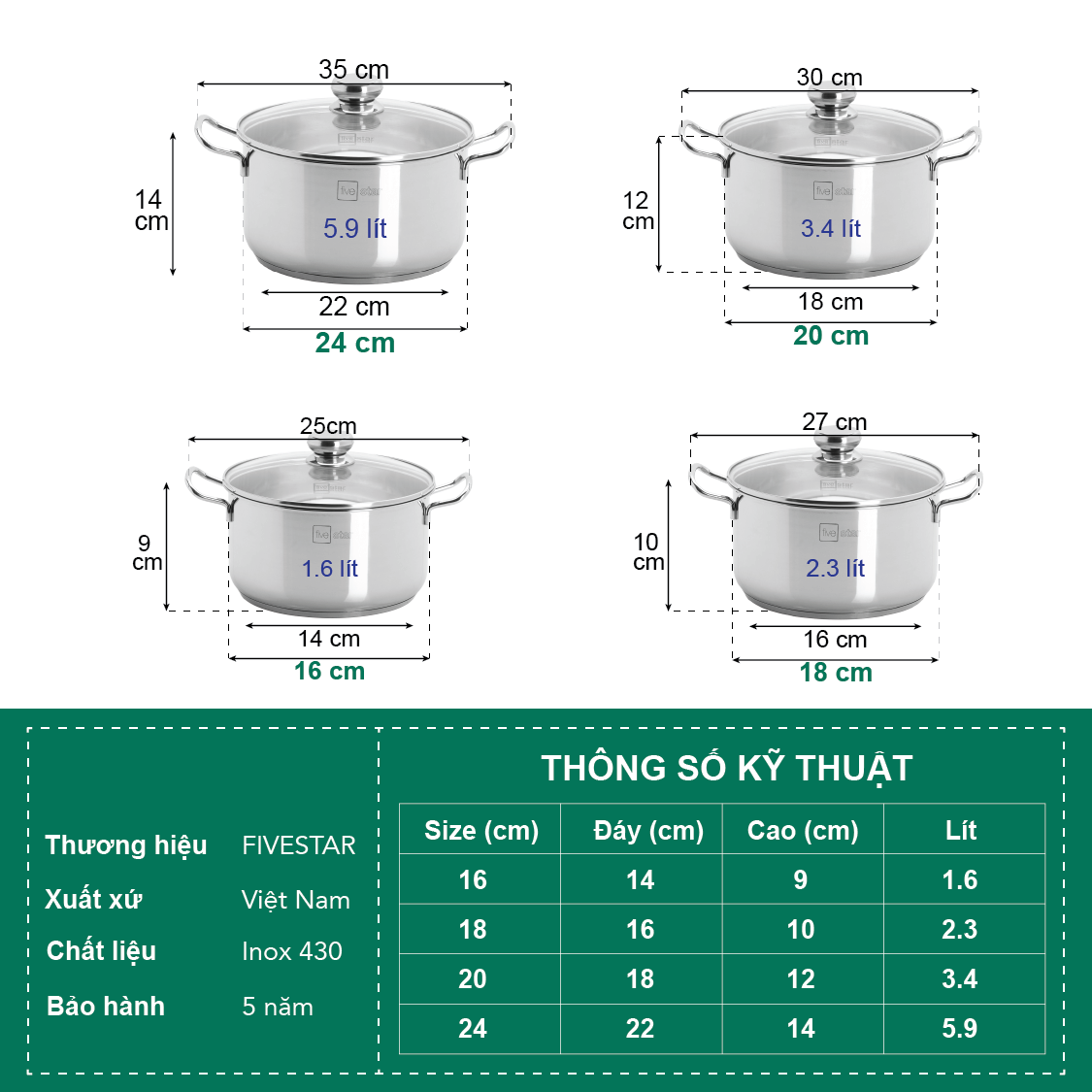 Thông số kỹ thuật Bộ 4 Nồi Nắp Kiếng 3 Đáy FIVESTAR FS08CG - Hàng Chính Hãng