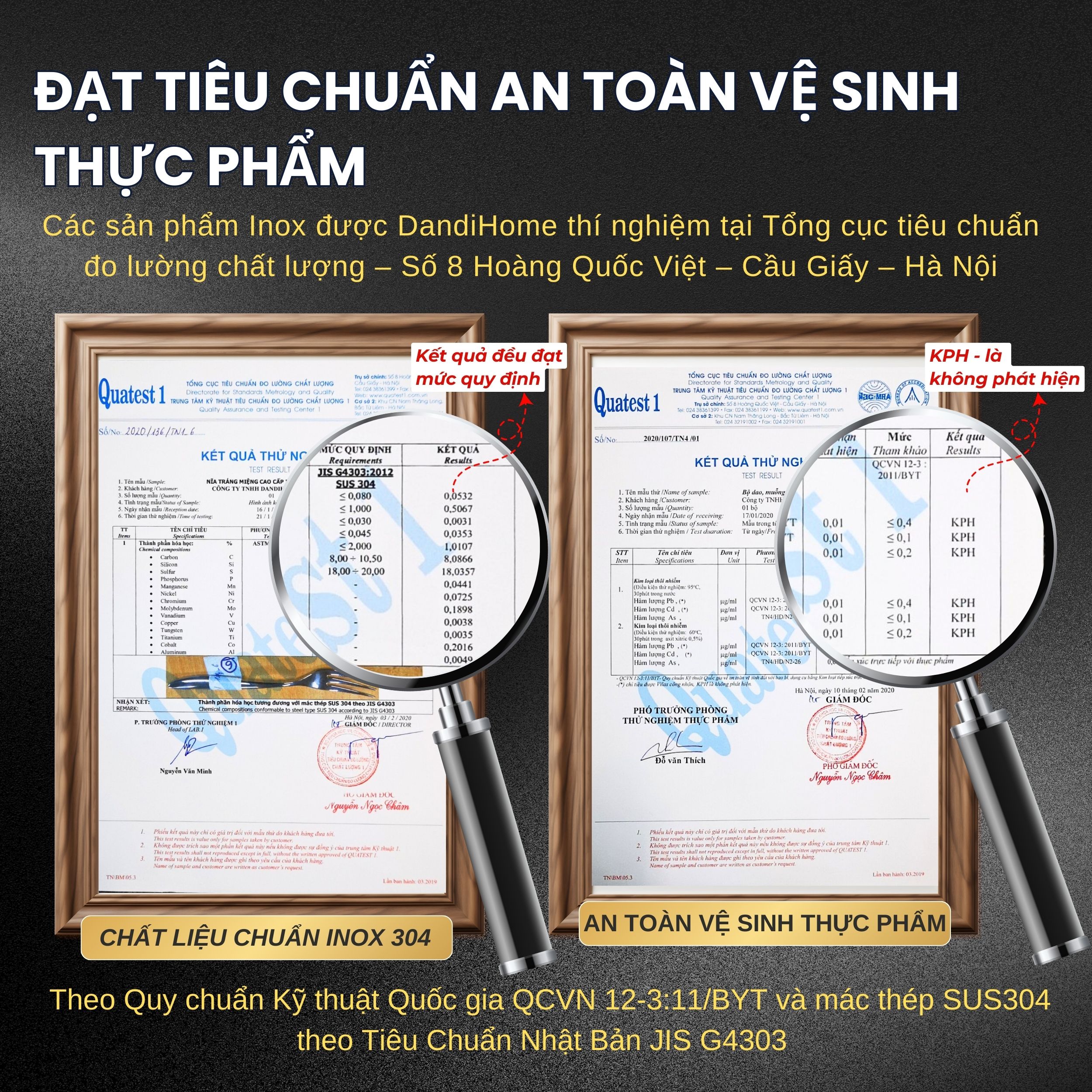 Các sản phẩm nĩa của DandiHome đều đạt tiêu chuẩn mác thép SUS304 theo Tiêu Chuẩn Nhật Bản JIS G4303: Hàm lượng Niken 8% – Crom 18% (Các sản phẩm Inox 304 được DandiHome thí nghiệm tại Tổng cục tiêu chuẩn đo lường chất lượng – Số 8 Hoàng Quốc Việt – Cầu Giấy – Hà Nội)