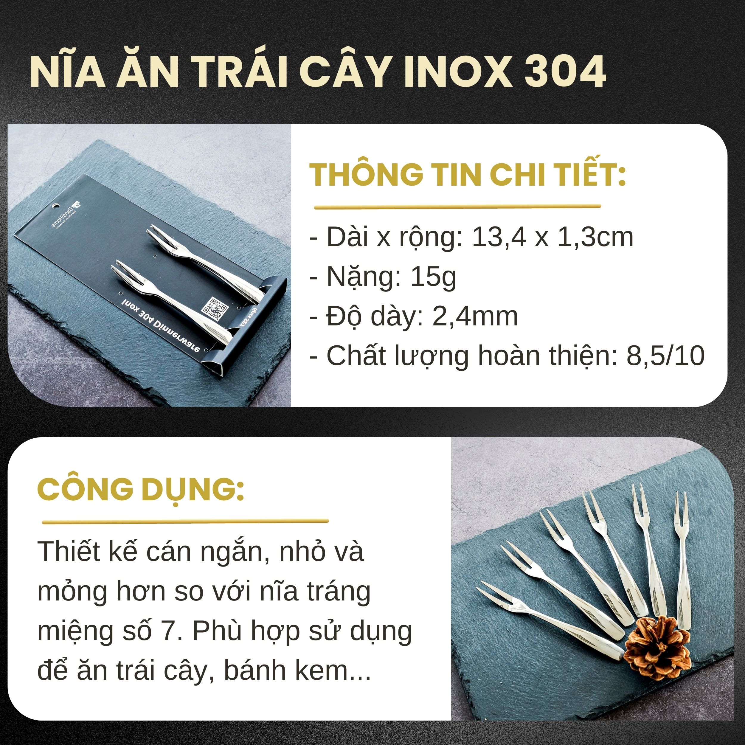 Tất cả nĩa inox DandiHome đều được làm bằng inox 304 cao cấp, thiết kế tinh tế cân bằng khi sử dụng và có độ hoàn thiện rất tốt từ 8 đến 10/10